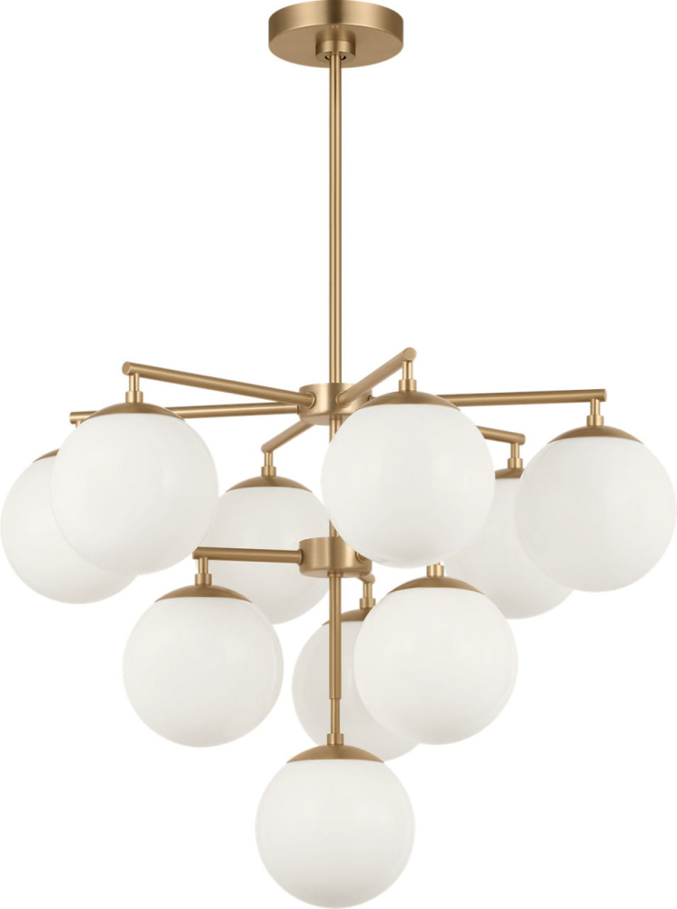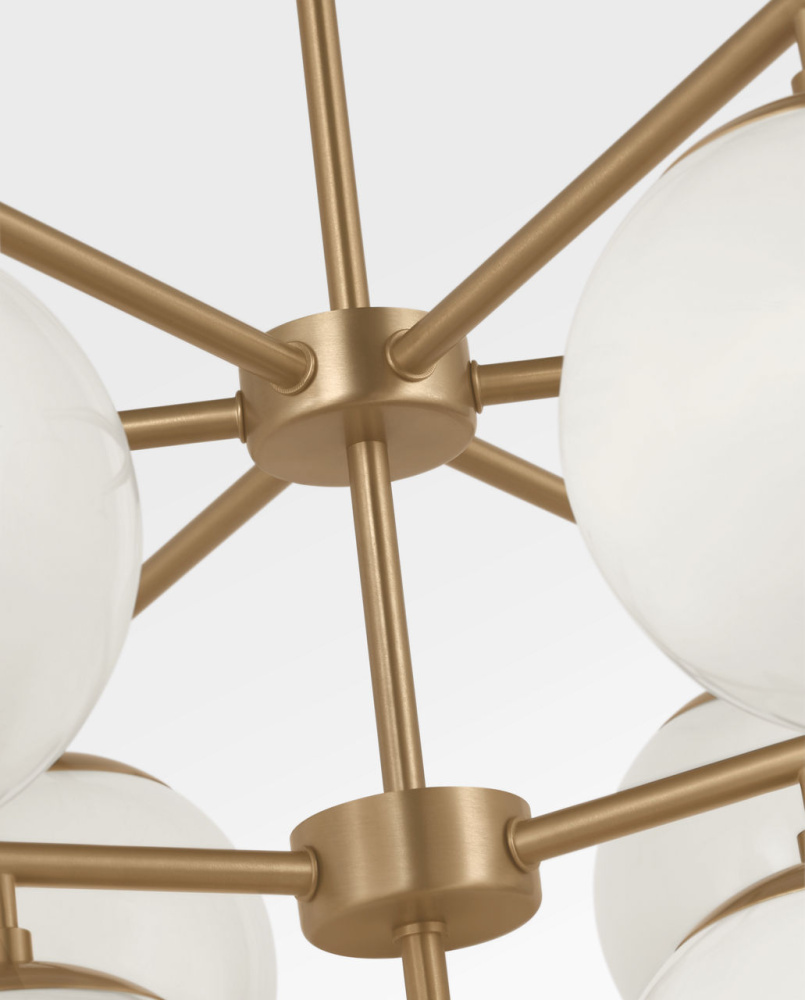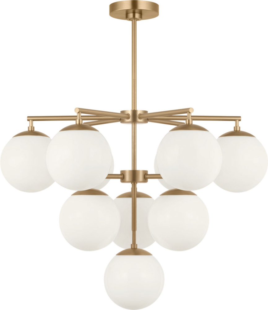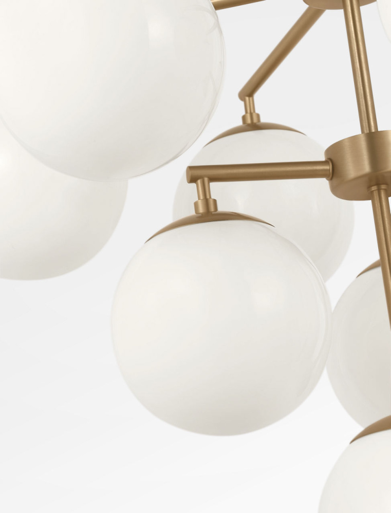 The Nube 10?Light Chandelier features ten layered milk glass globes that hover below a central hub and radial arms. Its balanced arrangement and open silhouette create an elegant focal point in large spaces such as grand living rooms or entryways. The chandelier delivers ambient, diffused light without heavy structure, allowing the glass forms to take visual precedence.