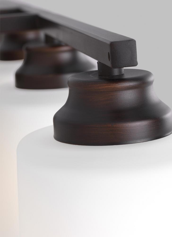 Transitional fixture in bronze finish will complement bathrooms, powder rooms, bedrooms, and hallways