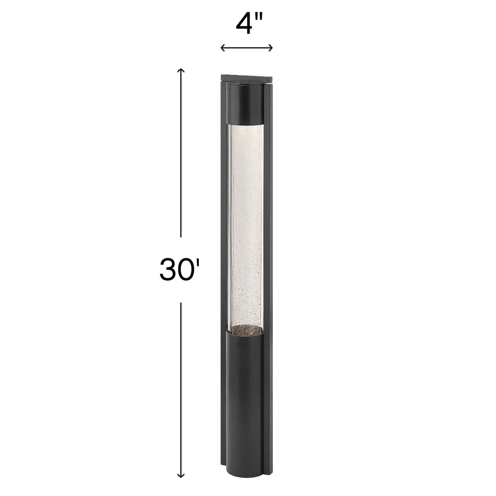 Shelter’s minimalist style in aluminum creates a chic, dramatic statement as the light from above grazes through its clear seedy glass. Shelter comes standard Dark Sky compliant.