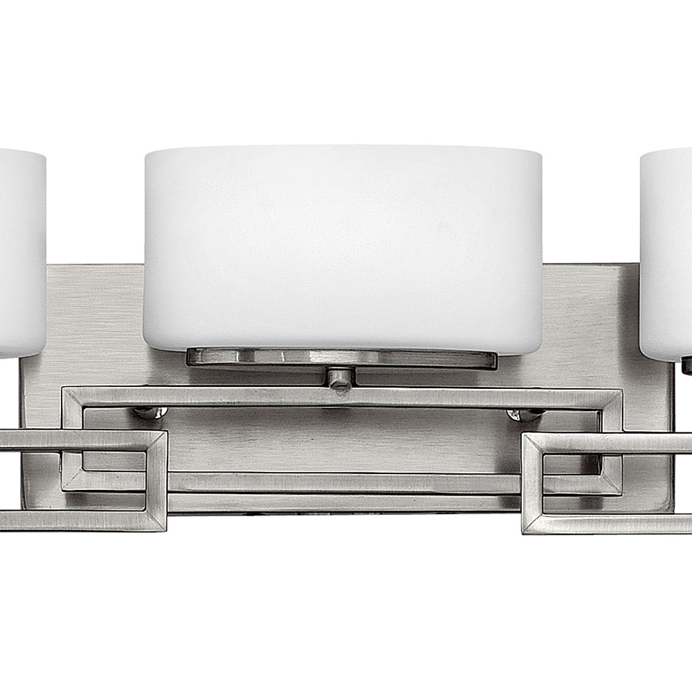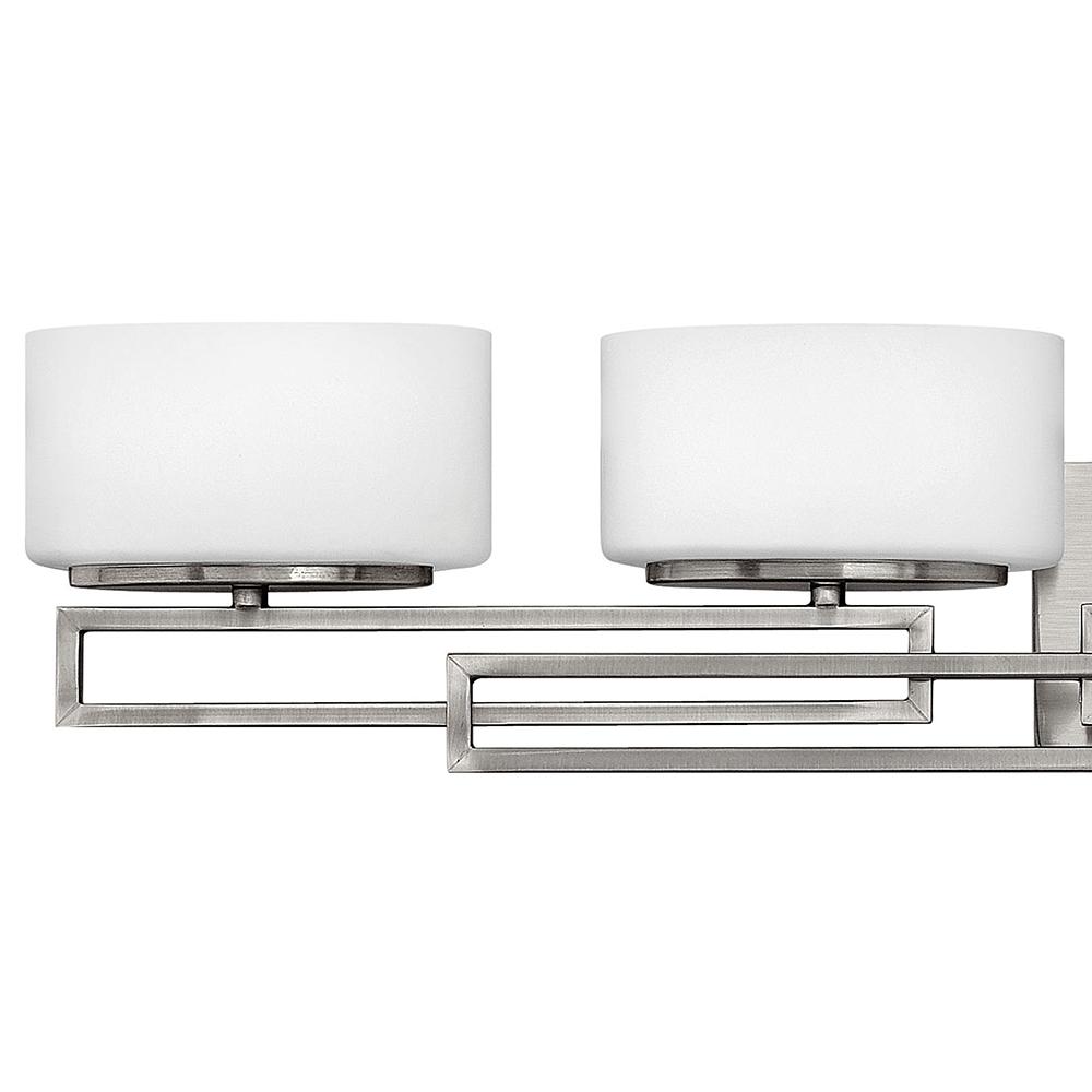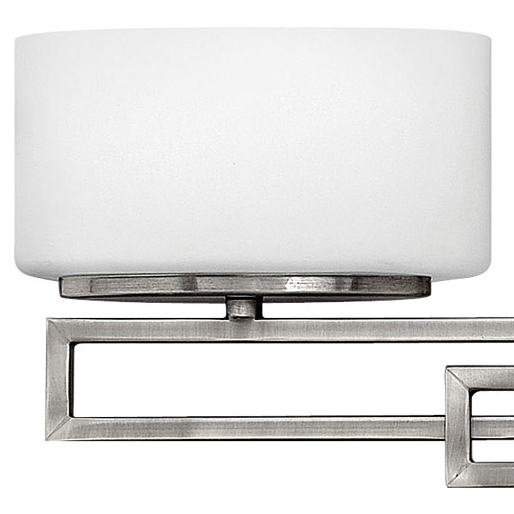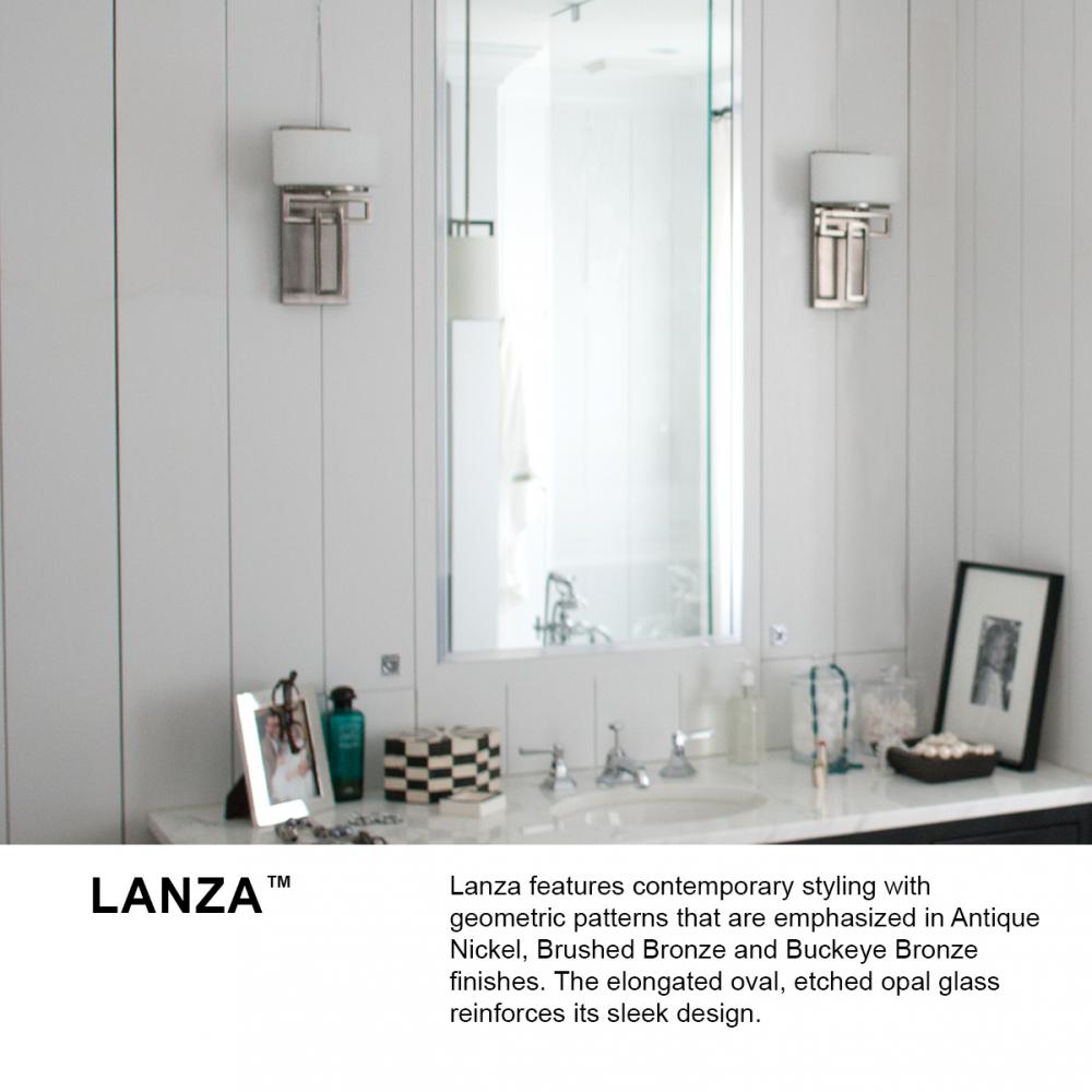 Lanza features contemporary styling with geometric patterns that are emphasized in Antique Nickel and Brushed Bronze finishes. The elongated oval, etched opal glass reinforces its sleek design.