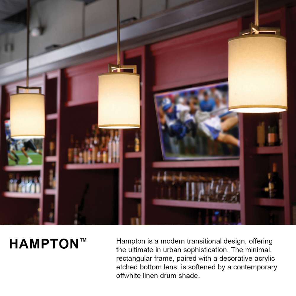 Hampton is a modern transitional design, offering the ultimate in urban sophistication. The minimal, rectangular frame is softened by a contemporary off-white linen drum shade.