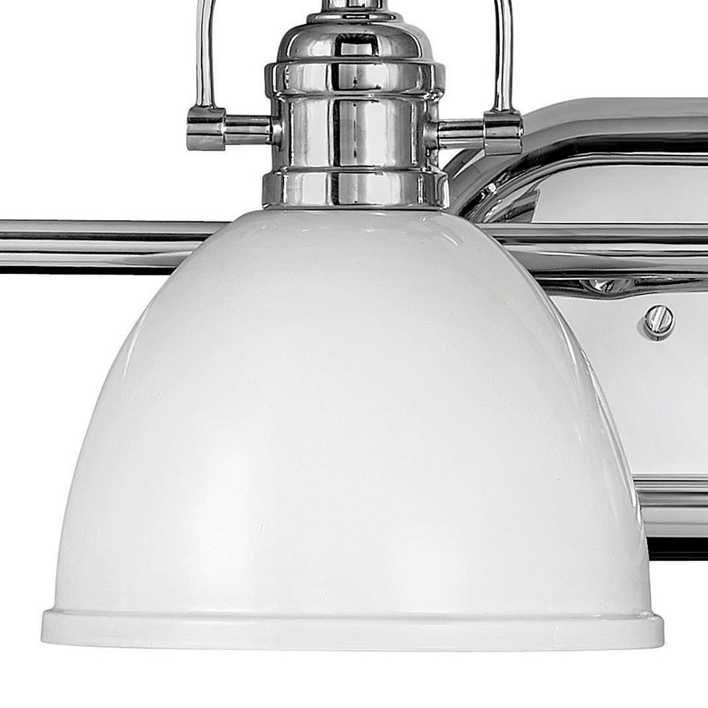 Rowan’s classic, yet contemporary look never goes out of style. Style details like its stepped Chrome backplate and industrial metal shade in Polished White are suitable for multiple decors. The harped fitter tops each dome with a decorative crowning touch.