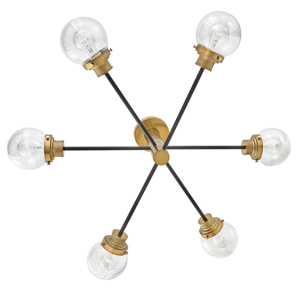 Poppy features clear seedy glass spheres that bubble out of refined, ribbed fitters to create a simple, yet sophisticated silhouette. The dual-finish combinations, Black with Brushed Nickel and Black with Heritage Brass, pair perfectly with a clean backplate or canopy and crisp crossbars to anchor this airy design. Poppy showcases mid-century style with a spectacular spin.