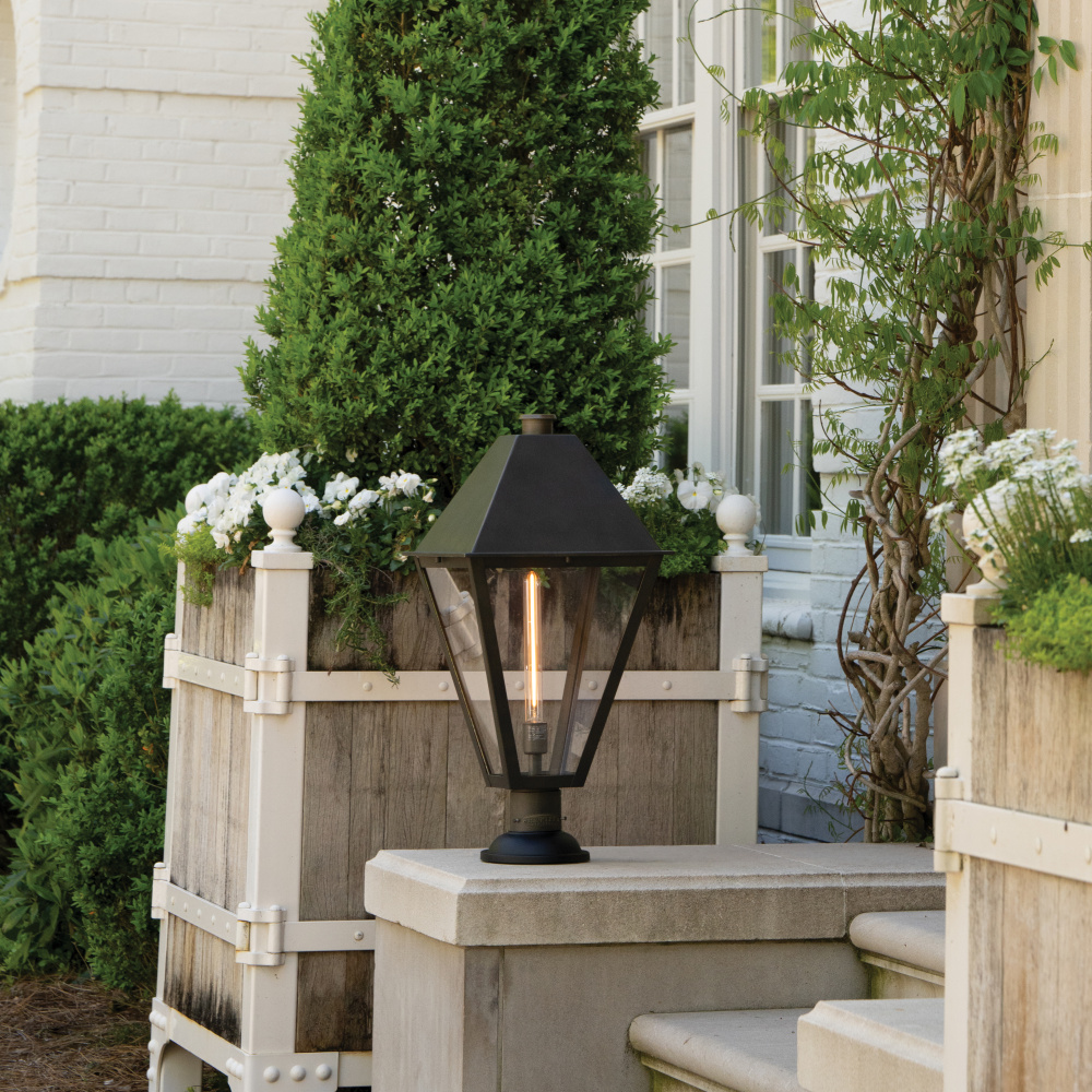 Endsley’s stately, modern gas lantern design features an oversized roof with a simple chimney, complemented by tall, clear glass and a painted, artisanal Blackened Brass finish. Each dignified fixture embraces traditional architectural details yet feels right at home in contemporary outdoor spaces.