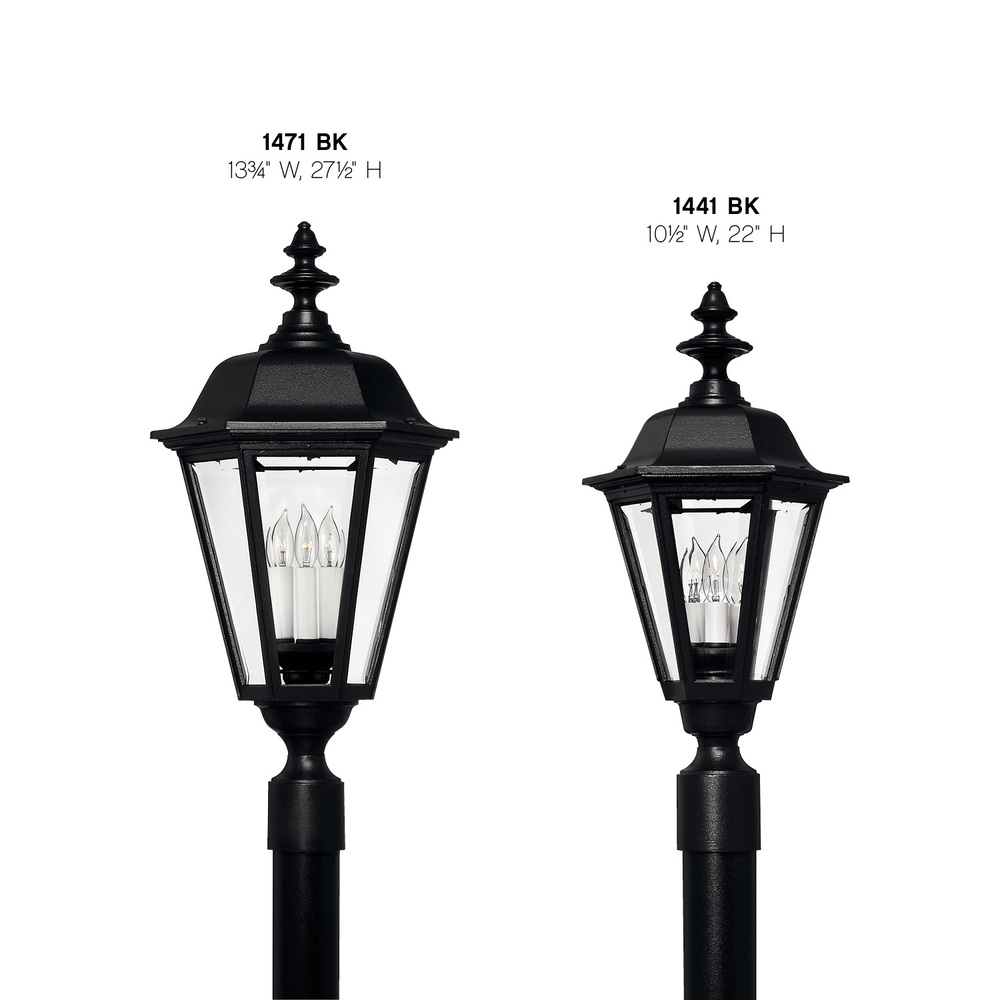 Manor House is a classic lantern design featuring durable cast aluminum, clear beveled glass panels and a bold Black finish. Select-A-Lite options come standard with both candelabra and medium based sockets.