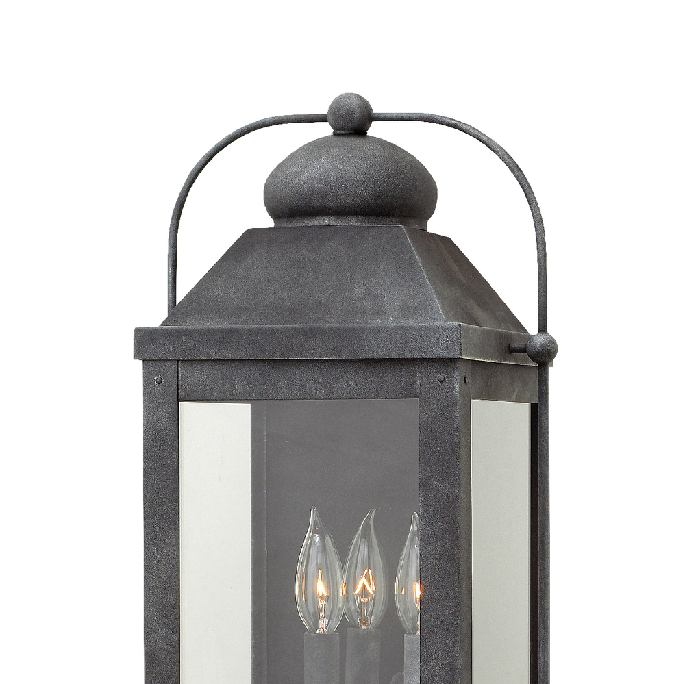 Anchorage is an early American lantern design crafted of solid aluminum to reflect a bold yet refined silhouette. The Aged Zinc or Light Oiled Bronze finish and clear glass complement the long clean lines, elegant arched carriage handle and sturdy knobs, resulting in a vintage style with classic charisma.