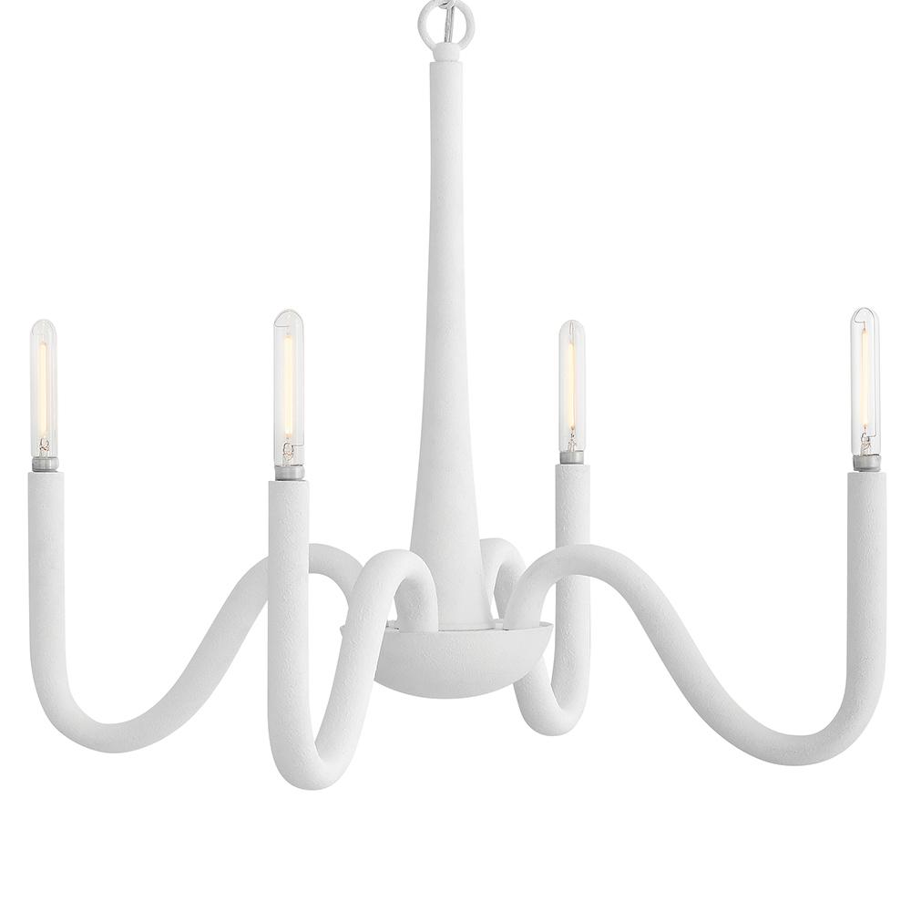 A breath of coastal freshness, Maris effortlessly complements any living or dining space. Exaggerated, curved arms with exposed candelabra lamps radiate from Maris’s center, evoking a formal silhouette. A white Textured Plaster finish imparts a chic, Californian feel.