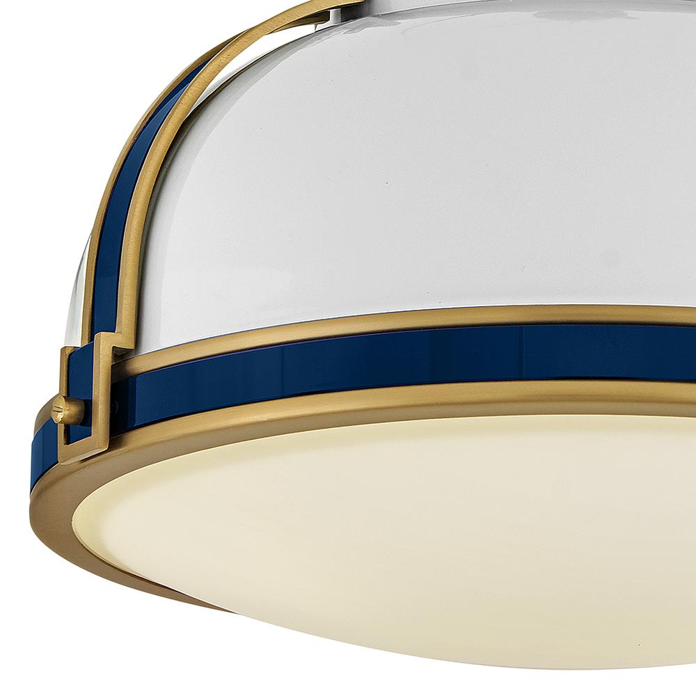 Timeless with a classic equestrian aesthetic, Barton’s metal dome shade with double-strap design is available in Matte Black, Matte White, or Gloss White with Navy finishes complemented by Lacquered Brass and an etched opal glass diffuser.