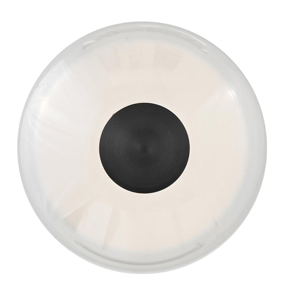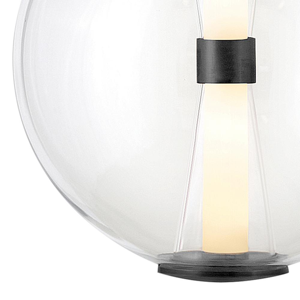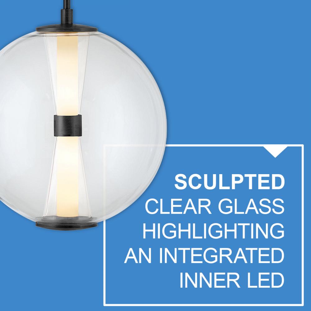 The centerpiece of Elin's bold and contemporary design is its sculpted clear glass that highlights an integrated LED inner light source. Featuring both conventional and striking elements, Elin is ideal for modern and transitional interiors and available in Black or Lacquered Brass finish options.