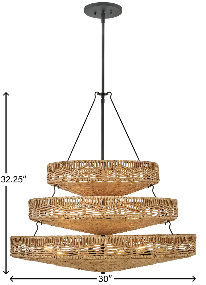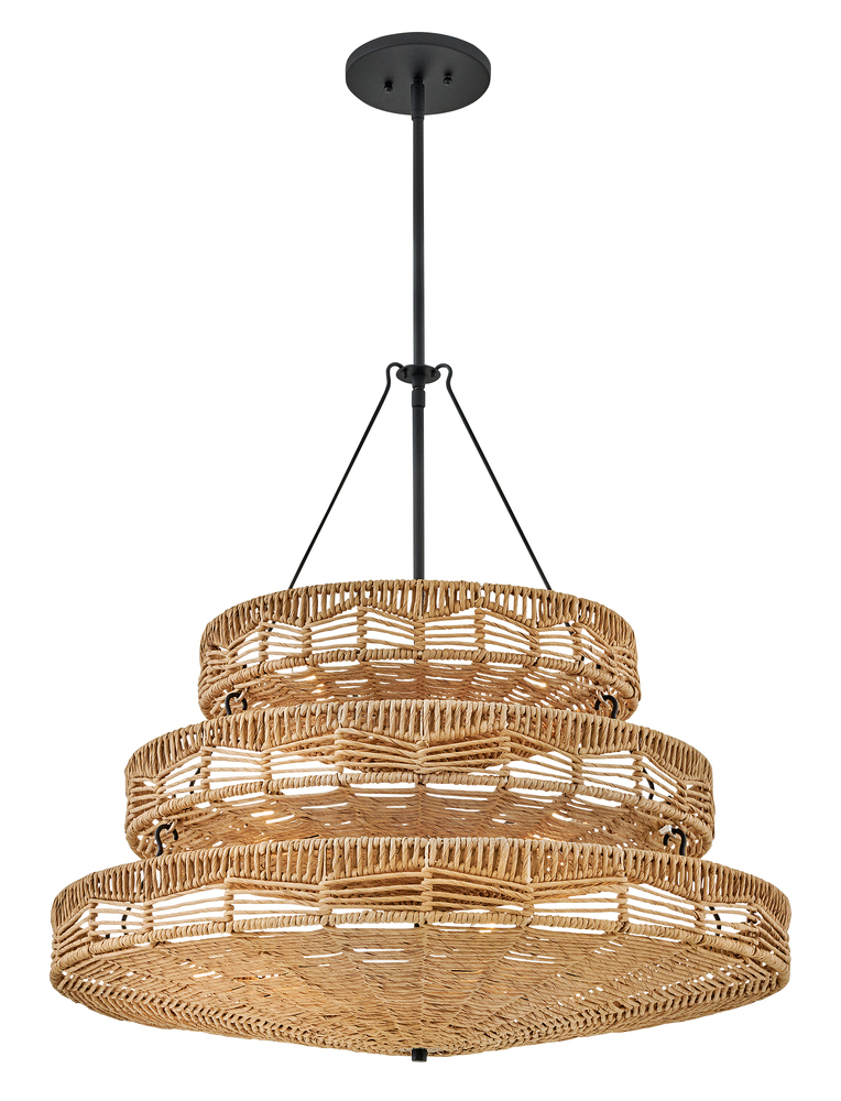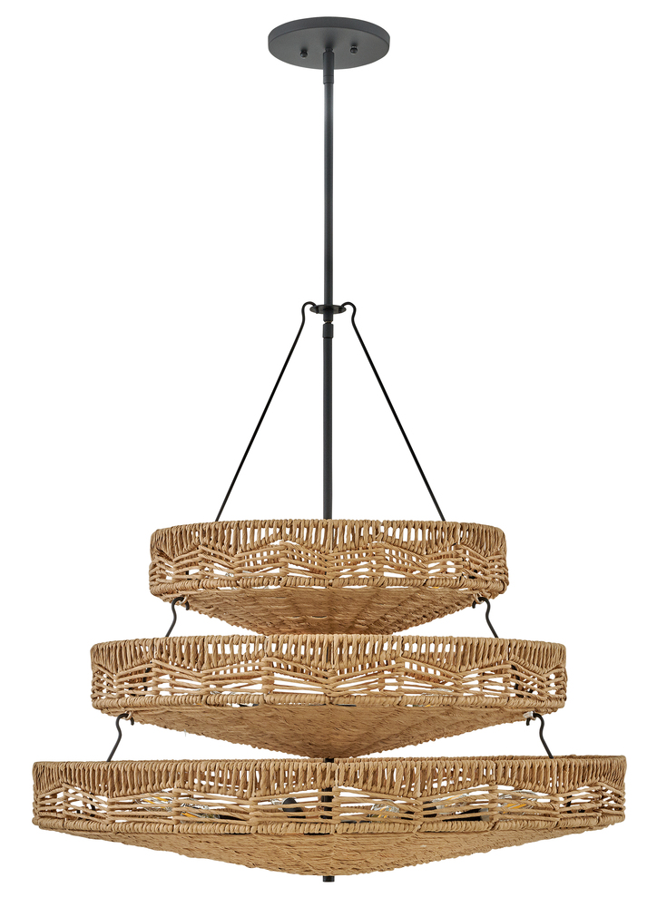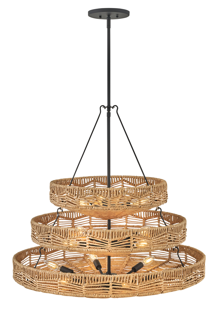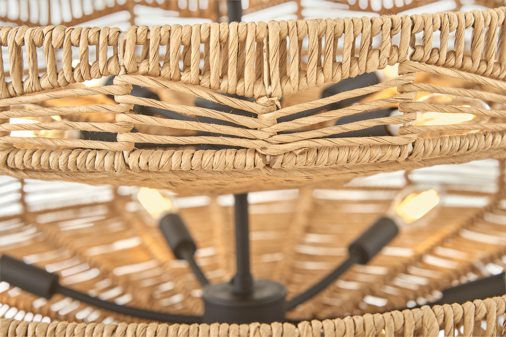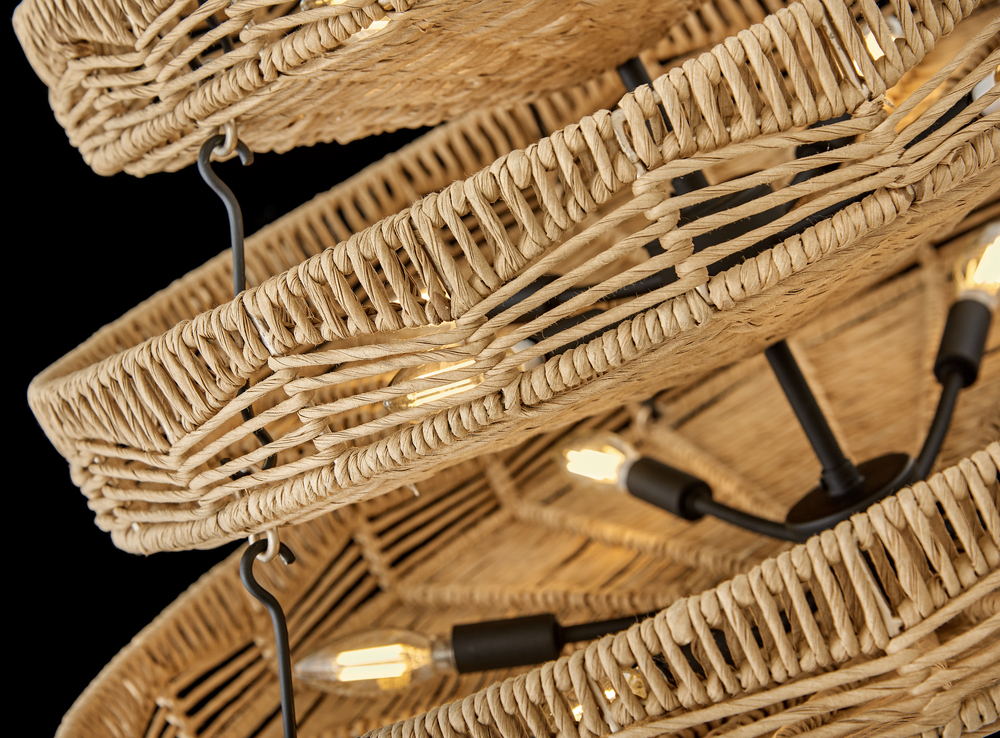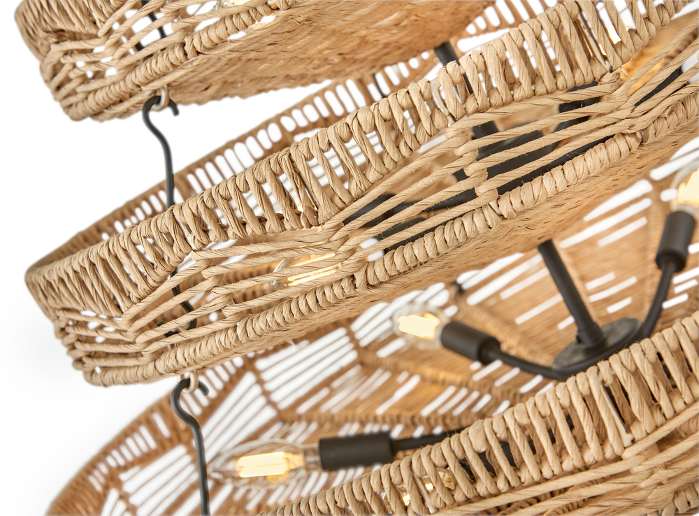 This dazzling design offers striking illumination through a beautiful handwoven pattern. Ophelia radiates with organic elegance as a natural shade adorns a tiered basket frame finished in Black.