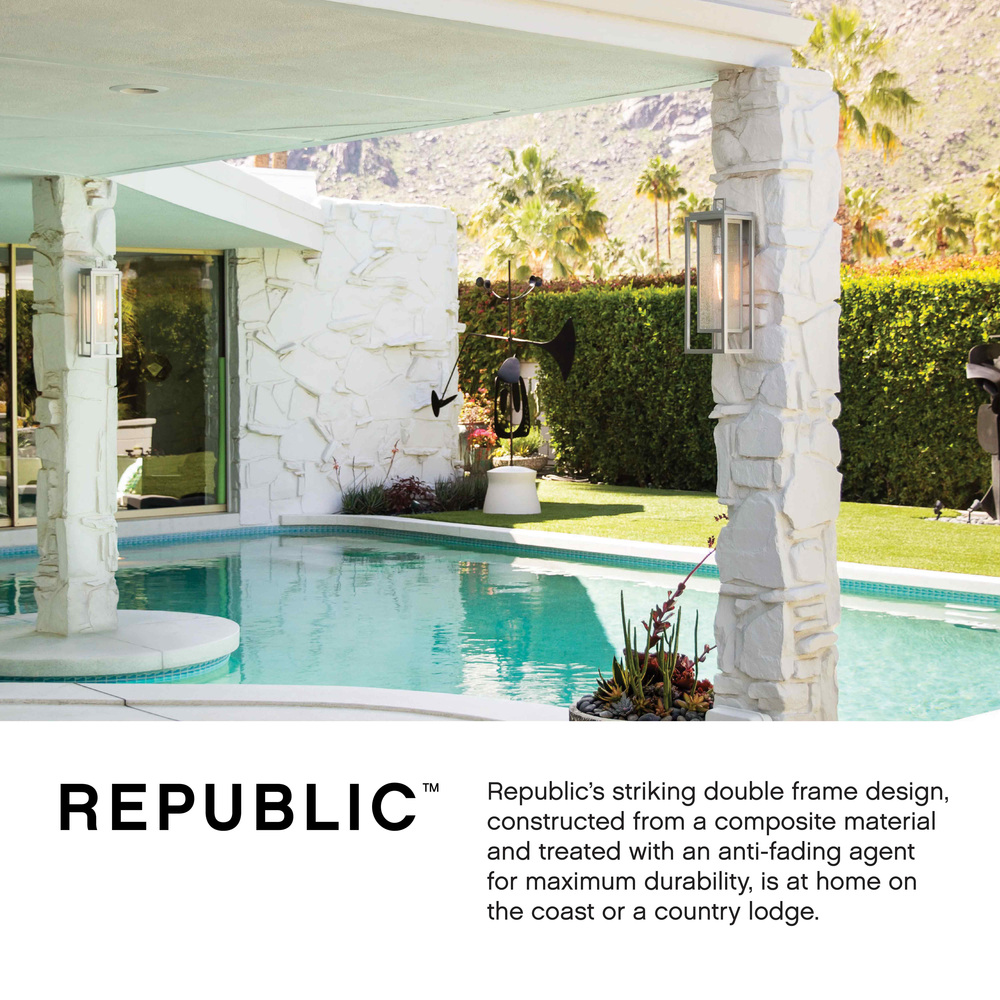Republic's striking double frame design, constructed from a composite material and treated with an anti-fading agent for maximum durability, is at home on the coast or a country lodge. The Oil Rubbed Bronze, Satin Nickel and Black resilience finishes feature a 5-year warranty and are resistant to rust and corrosion. Vintage filament bulbs are recommended to complete a stylish look.