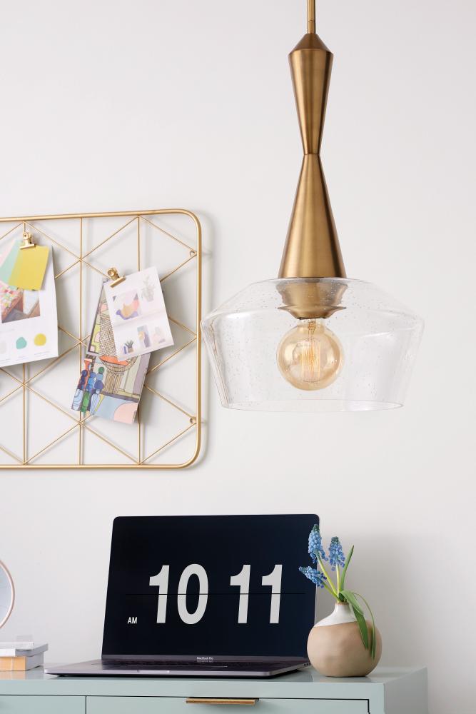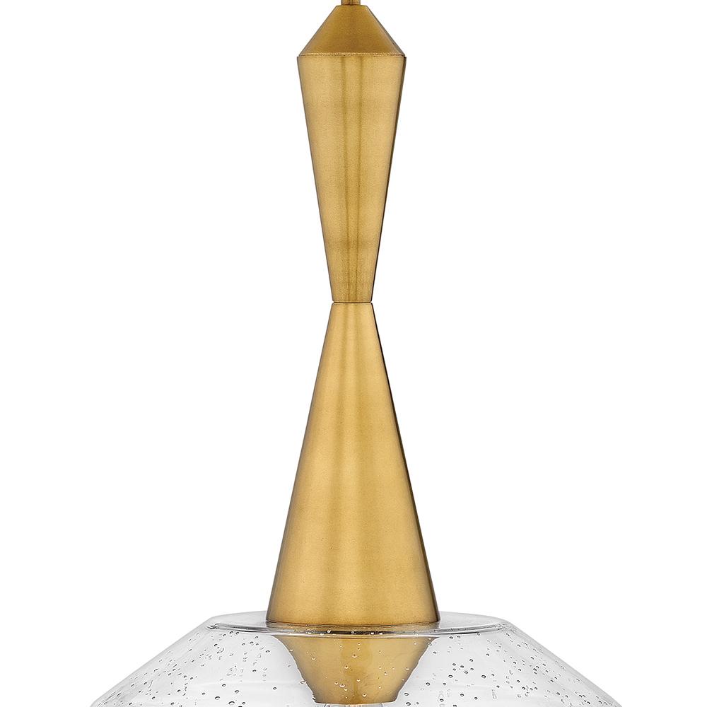 The Bette pendant captures perfection from every perspective. The distinctively angled, clear seedy glass shade has a mid-century modern profile that is both bold and sophisticated, while the tapered fitter echoes the angular glass. Luxe Heritage Brass or Polished Nickel finish options enhance Bette's panache.