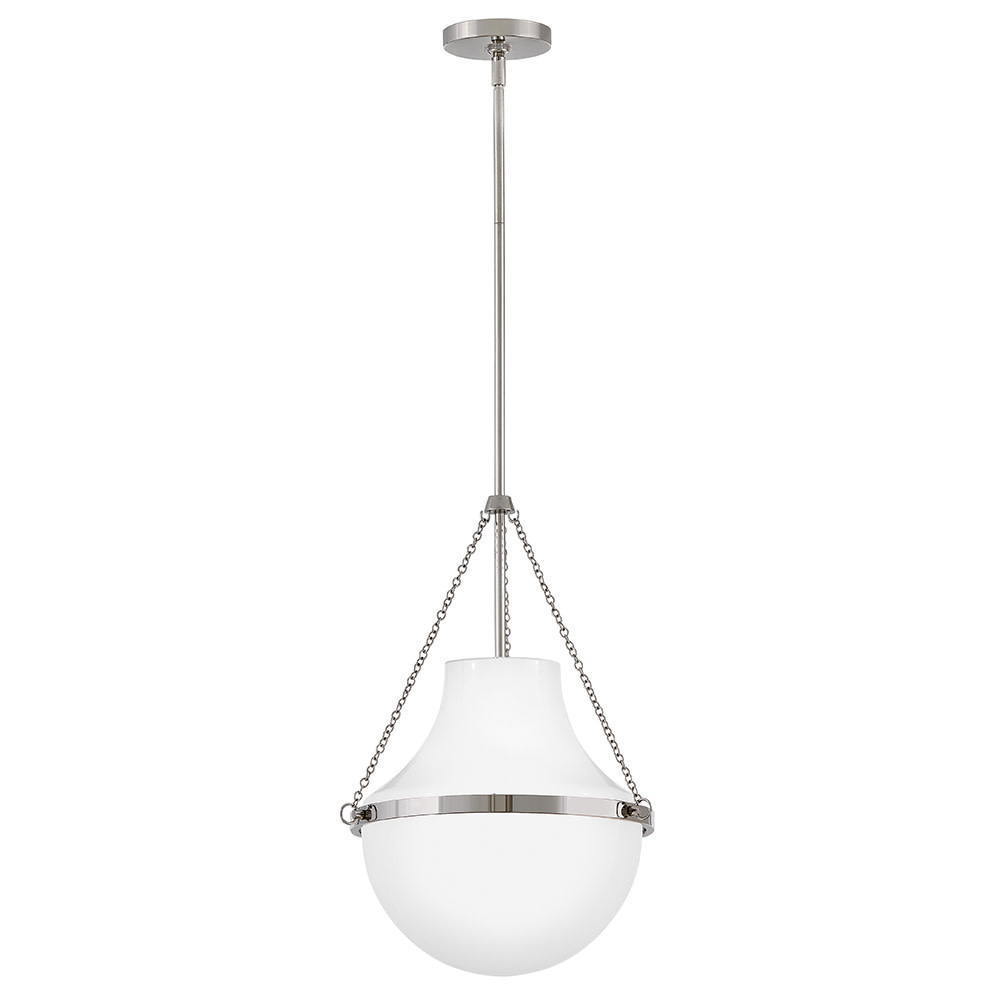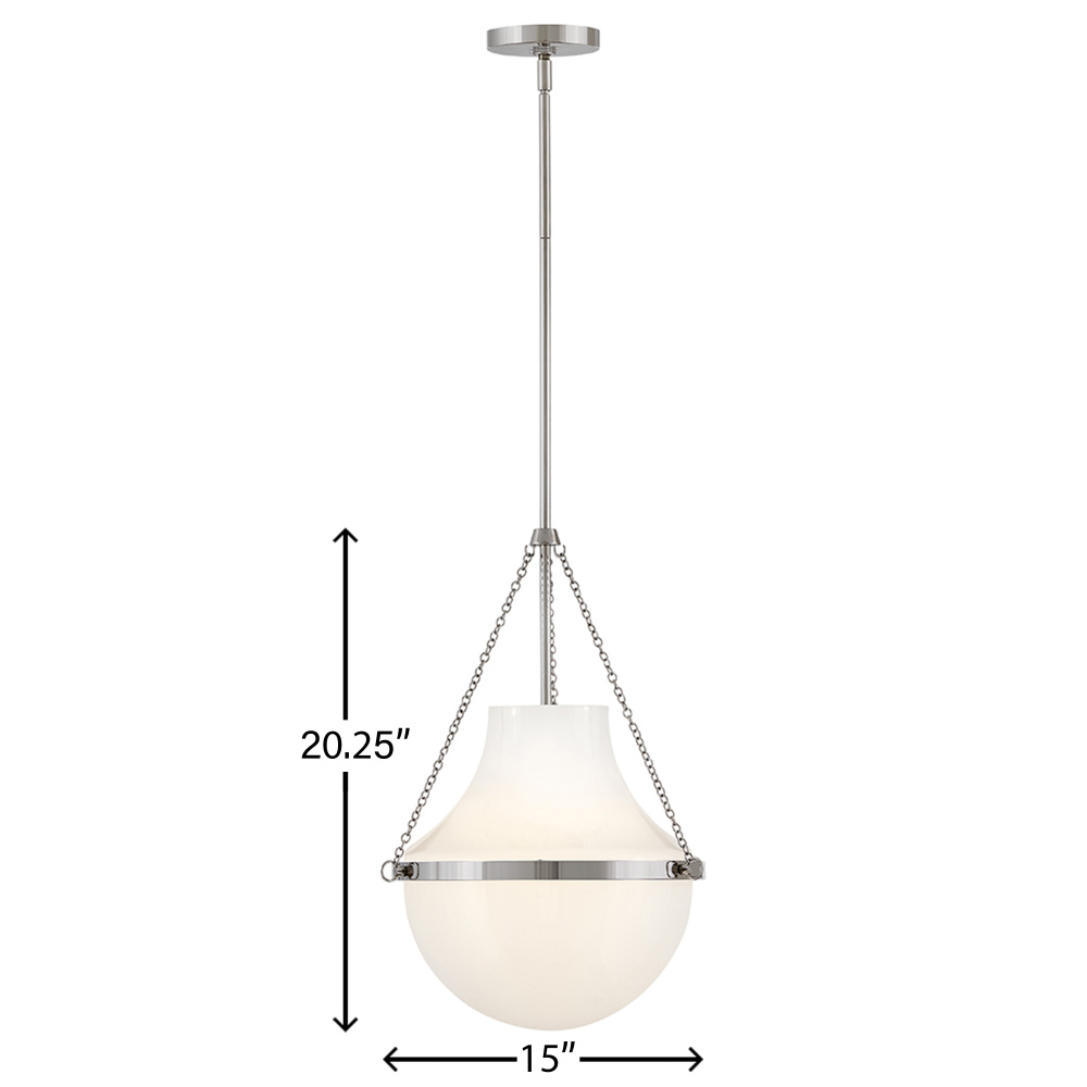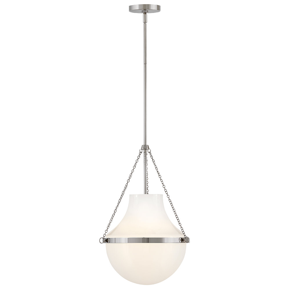 Fusing a sculpted, modern form with classically styled details, Collins features a transitional teardrop shade crafted from blown, cased opal glass. A central metal band and delicate chain uprights are available in Heritage Brass or Black Oxide finishes.