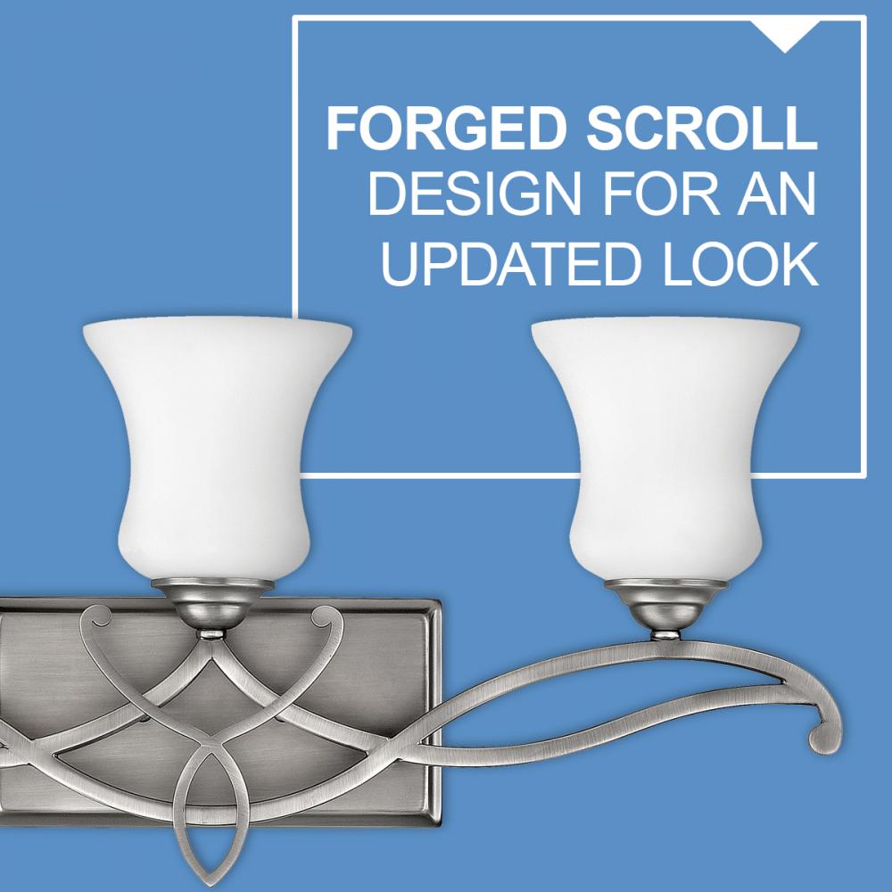 Brooke's updated traditional look features a minimalist forged scroll design in Antique Nickel and Olde Bronze that elegantly complements its etched opal glass.