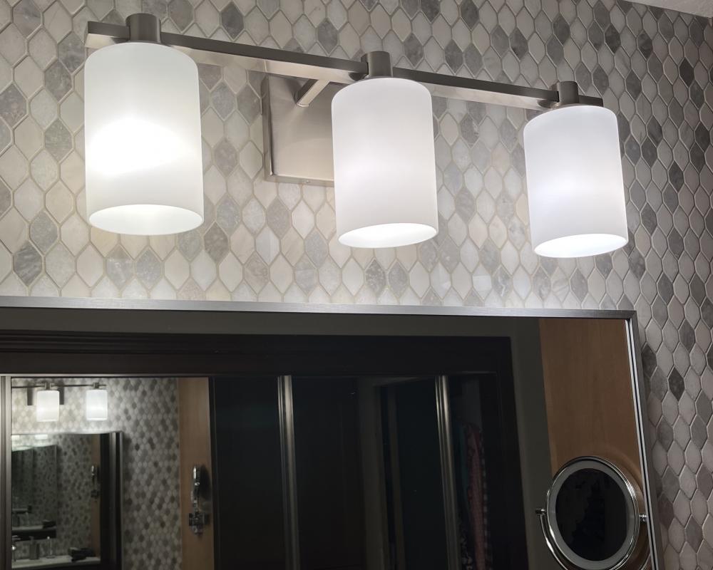 Karlie's clean design is transitional in style and will complement a variety of décor. Featuring precision die-cast cups and cylindrical, etched opal glass, it is available in Brushed Nickel and Chrome.