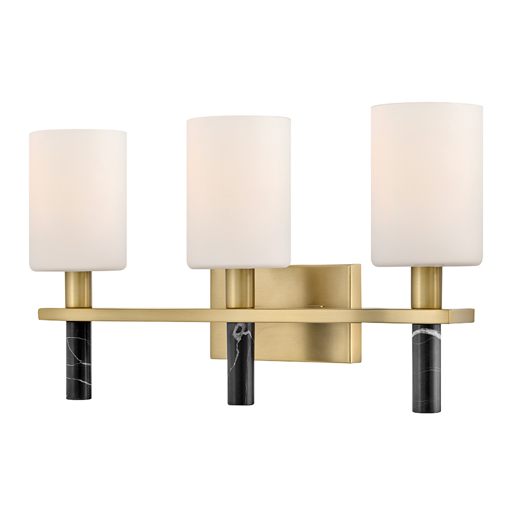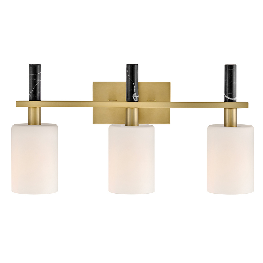 Polished with an understated silhouette, Turin is elevated by tall Etched Opal Glass and luxurious black marble stems. A minimalist backplate finished in vibrant Lacquered Brass complements the natural stone with an elegant touch of warm color.