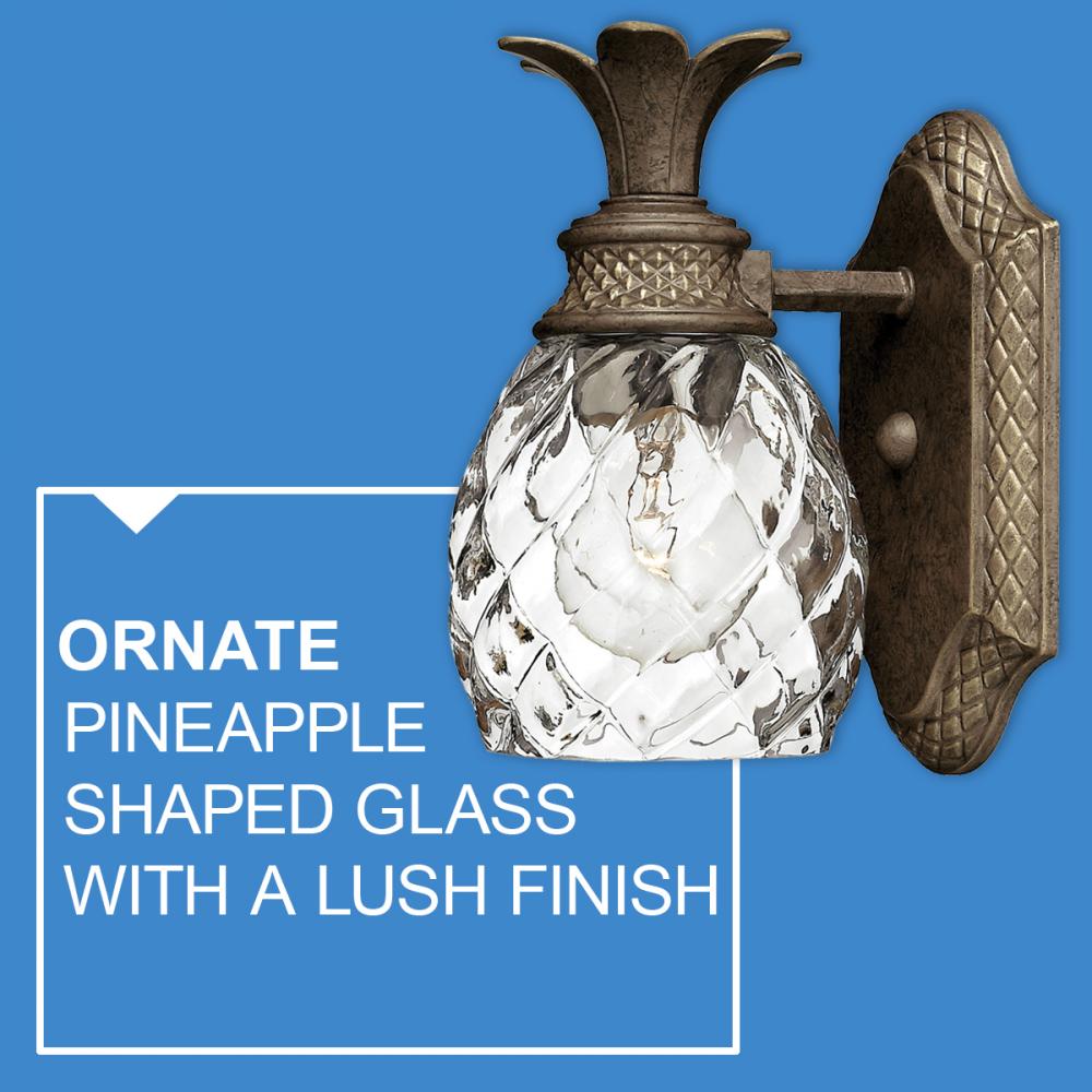 A Hinkley classic, the ornate Plantation collection features exceptional pineapple shaped, clear optic glass that makes a noble statement. The elaborate, decorative cast detailing is accentuated by its lush finish.
