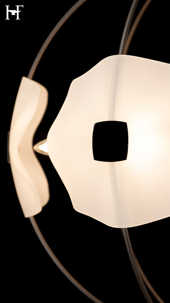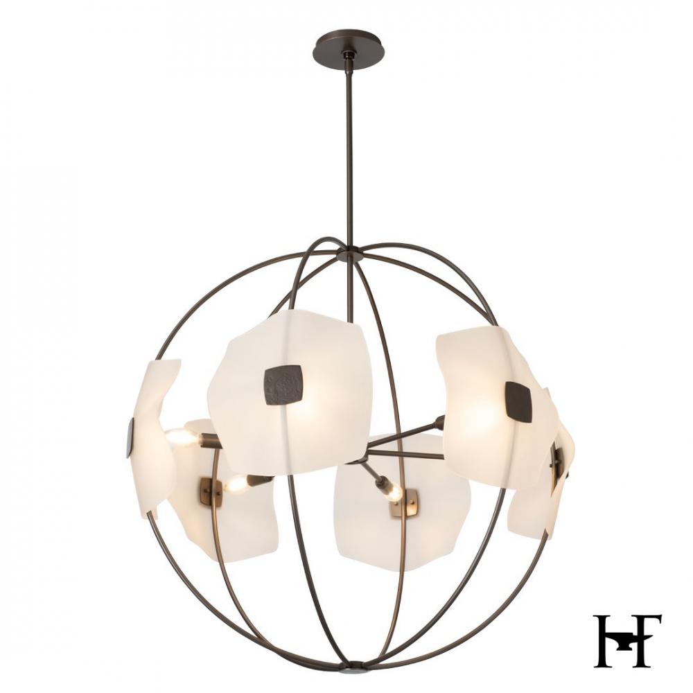 The six light Astra Orb Small Pendant features gently slumped handmade glass, complementing each curved metal arm of the fixture. Each stunning piece of glass is held in place by a hand-forged medallion for a sophisticated look.