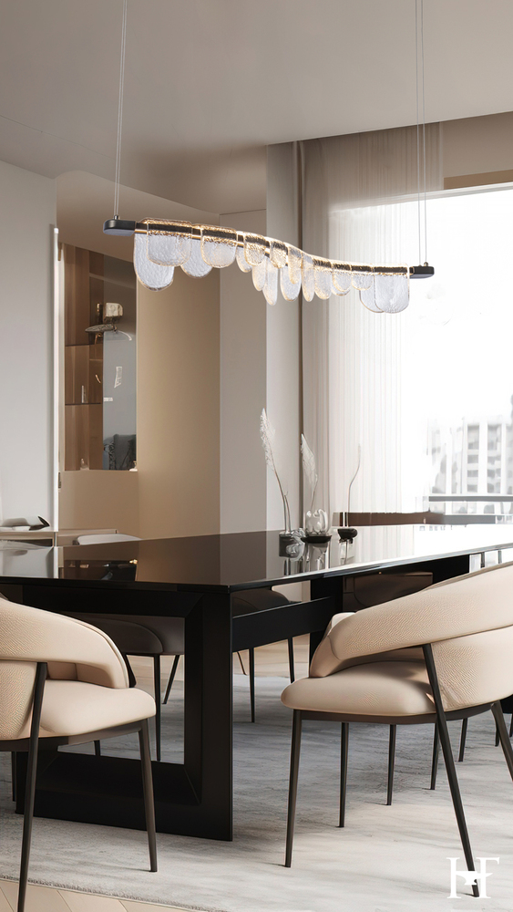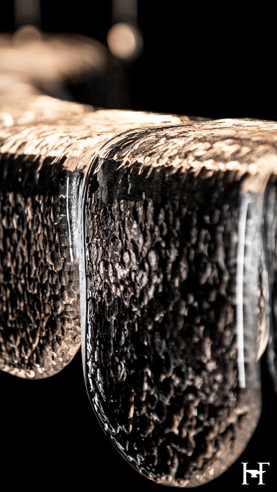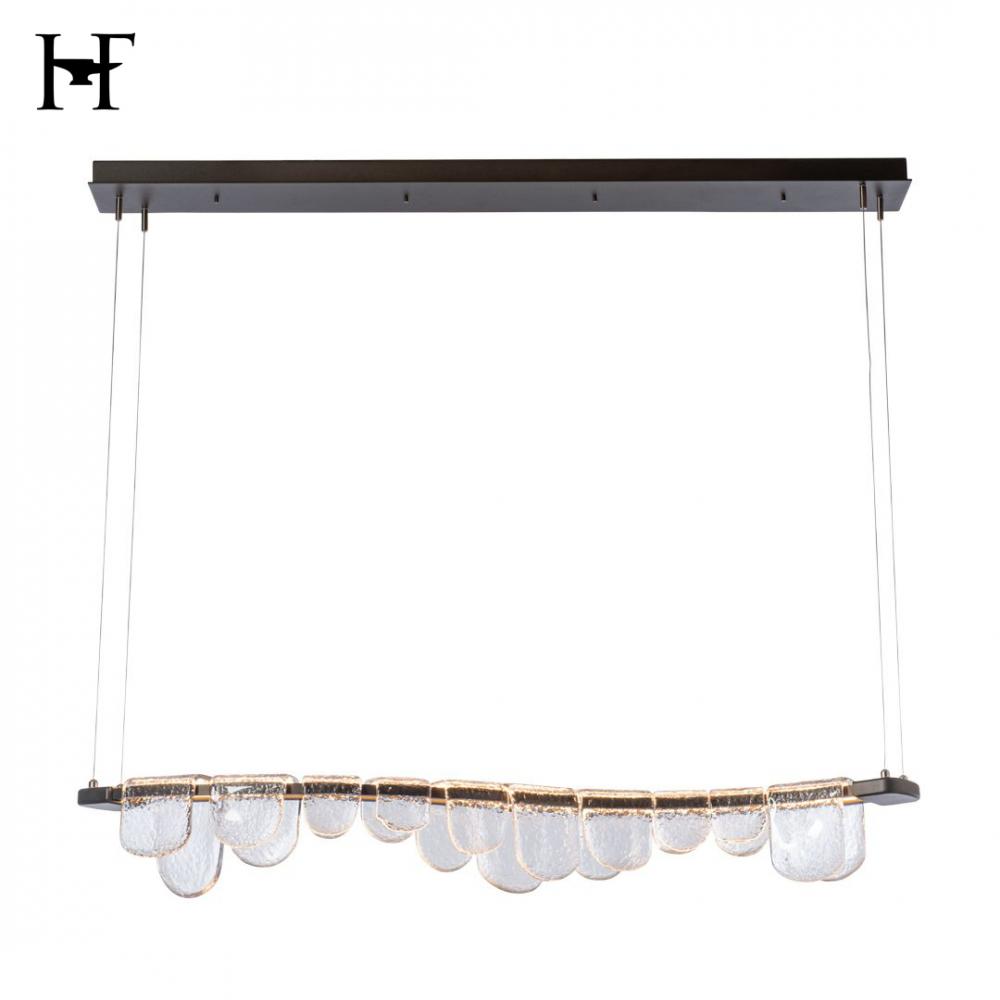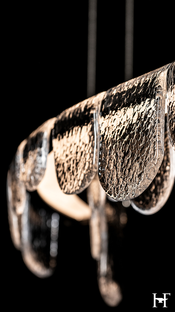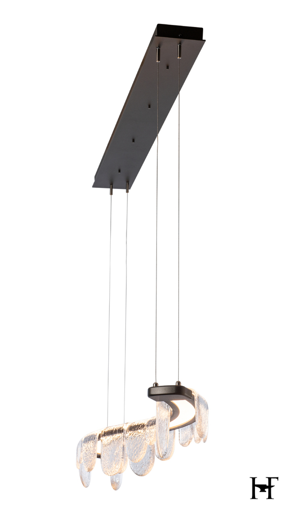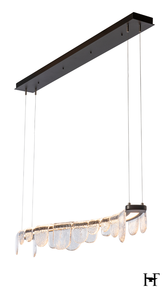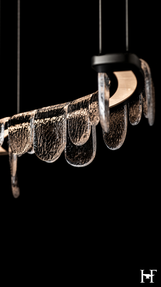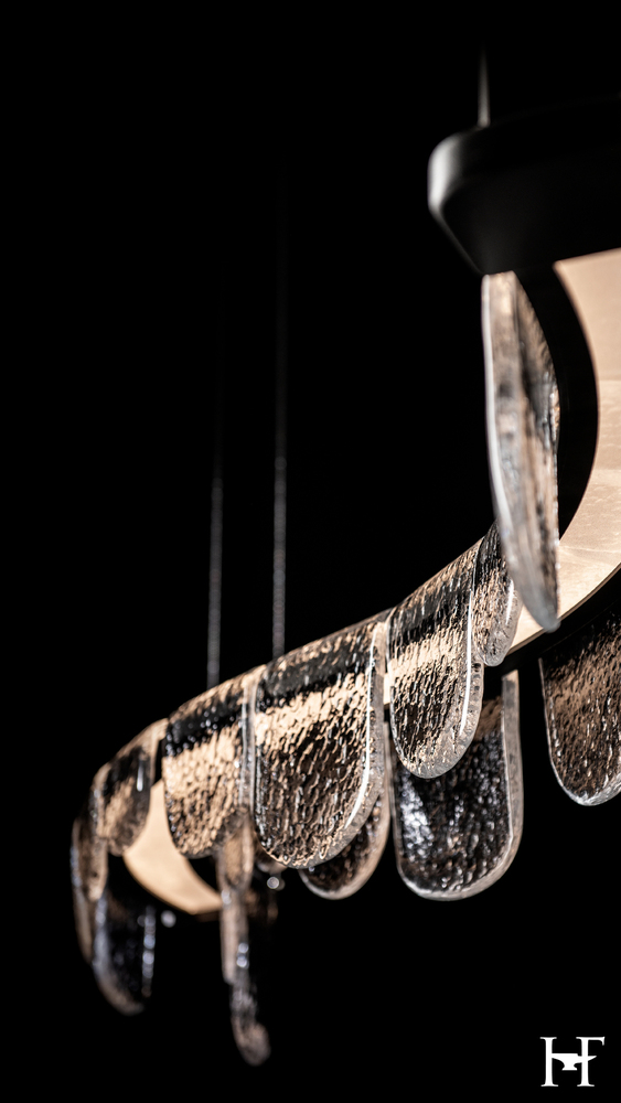 Inspired by the cold icy streams of Vermont that are adorned with ice covered rocks and frozen boulders, this riverbed of light with meandering artisan glass is stunning. Featuring a curved LED light-guide platform, the Riverbed Pendant’s unique, clear, textured poured glass has been formed and shaped like frozen stones along the river’s edge by our local partner, AO Glass, working with HF designer Andy Morter.