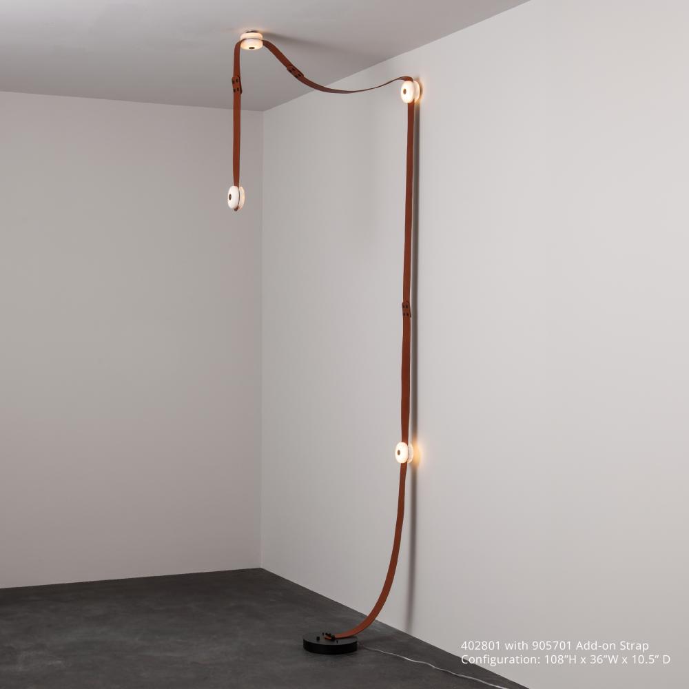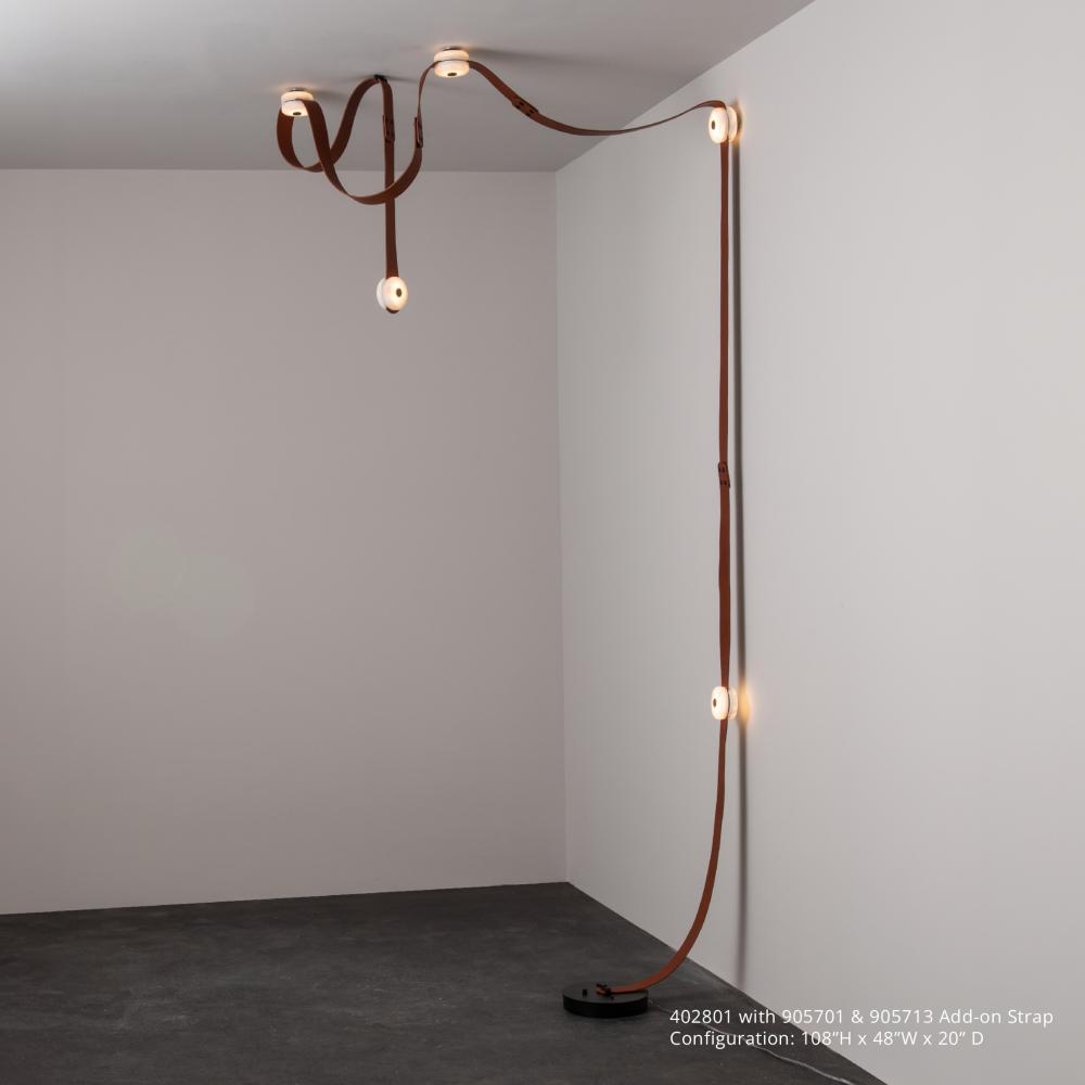 "There's just something inherently cool about snaps and leather" is how it all started for HF designer Andy Morter. Using a combination of fine leather, alabaster stone and metal, he adds hidden LED technology to create this SNAPS piece with the added versatility of being a floor plug-in for spaces without an electrical box. This portable SNAPS can be swagged over a piece of furniture, and can easily be extended, as needed beyond its two large and one shorter leather straps with optional additional elements. Unleash your creativity by ordering one of these extension pieces: 905700, 905701, 905712, 905713.