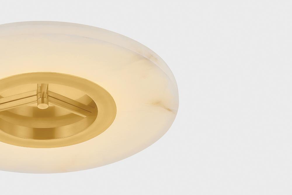 The Alto flush mount serves as a striking sculptural piece on the ceiling. When illuminated, the natural alabaster comes alive with intricate veining, creating an upscale, yet minimalist lighting effect. While the fixture feels fresh, the Aged Brass frame lends Alto an antique feel. Due to the one-of-a-kind nature of the medium, exact colors and patterns may vary slightly from the image shown.