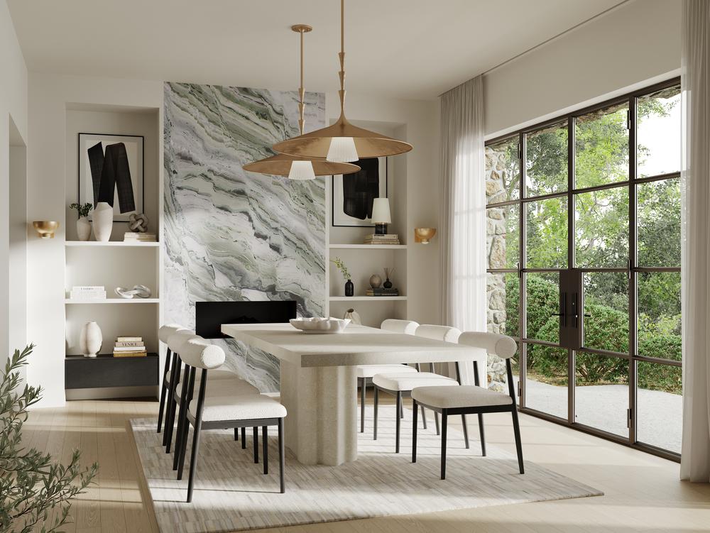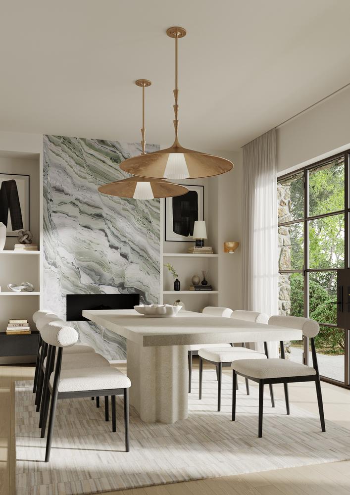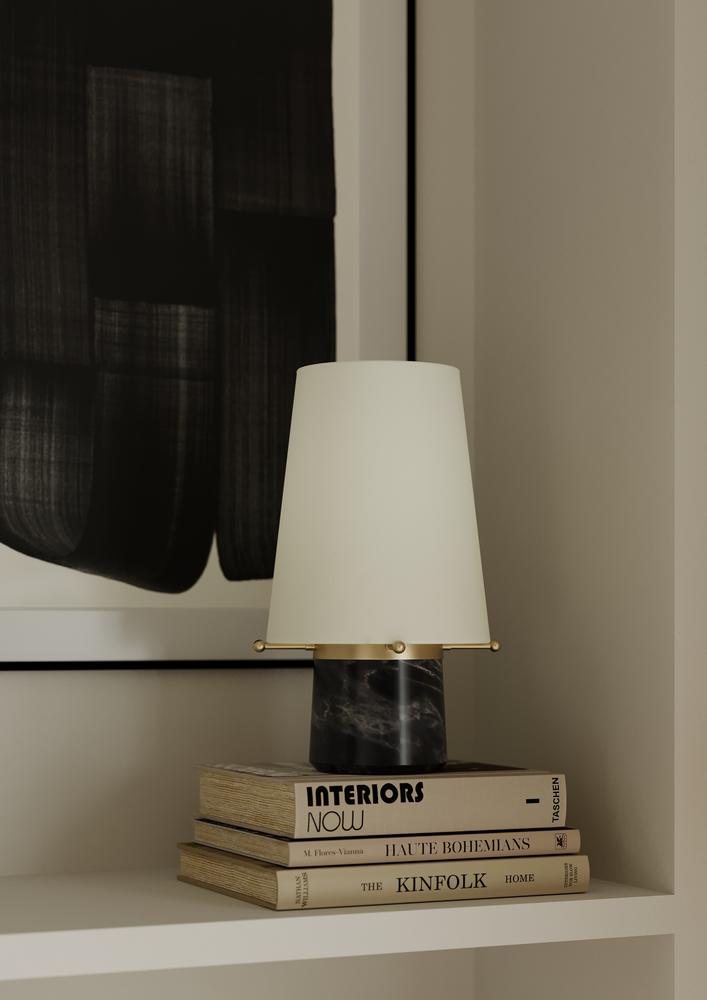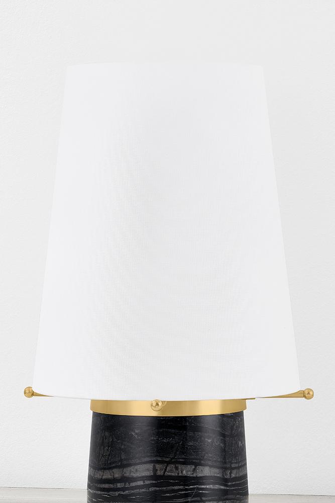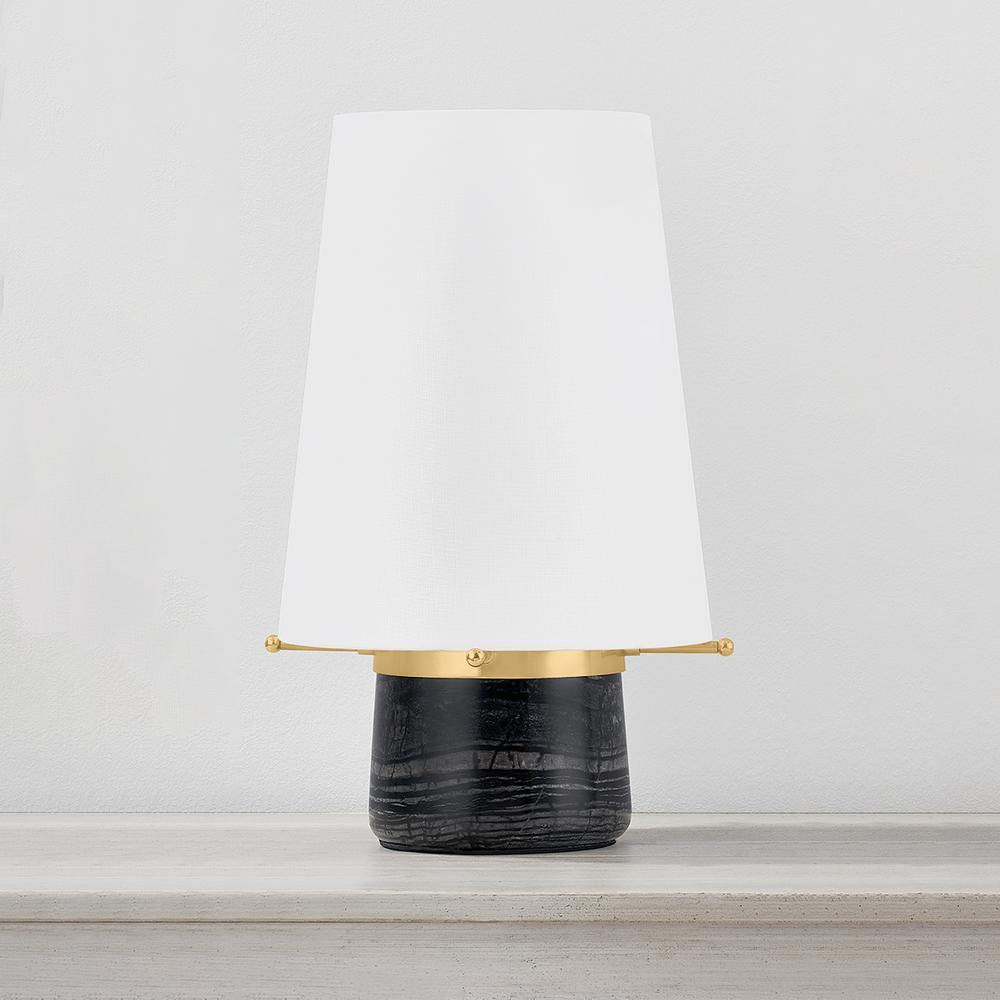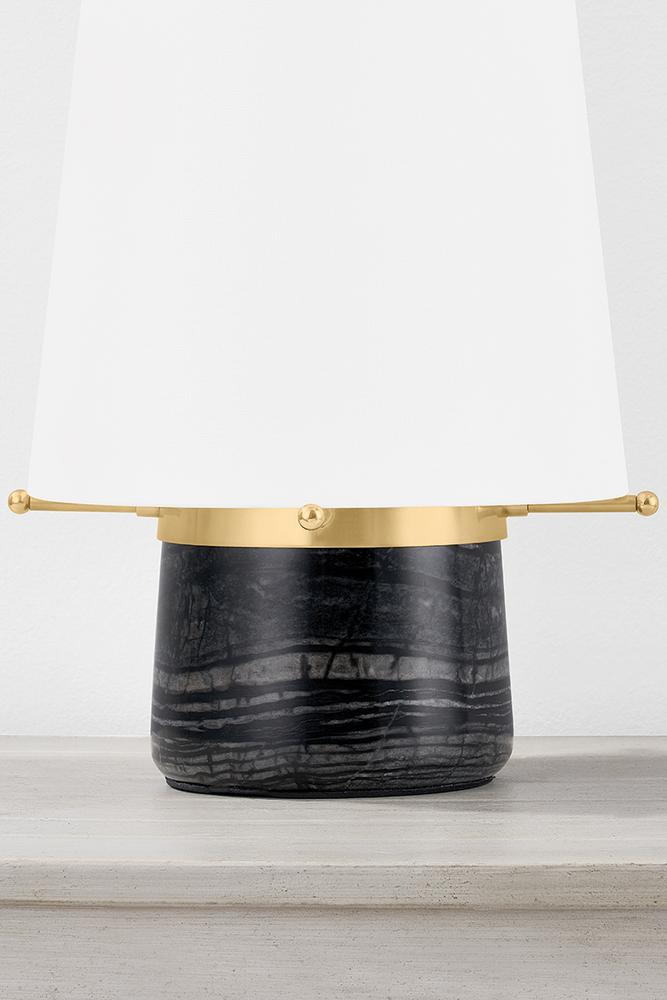 A clever play on proportions, shapes, and materiality, Central Valley is a petite table lamp with a big personality. A large white linen shade tops the weighty dark-honed Nero Madera marble base, with the shape of the shade following the exact angles of the stone. to bridge these two opposing forces, distinctive spokes extend from the base to secure the shade, adding a jewelry-like quality. The Aged Brass finish lends a stately sense of elegance. Due to the one-of-a-kind nature of the medium, exact colors and patterns may vary slightly from the image shown.