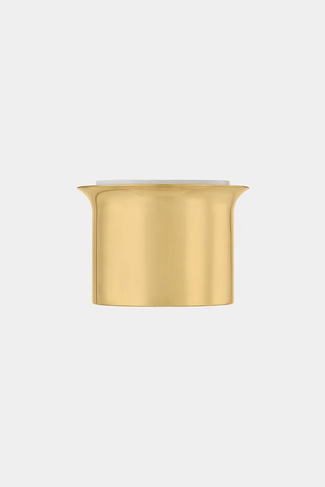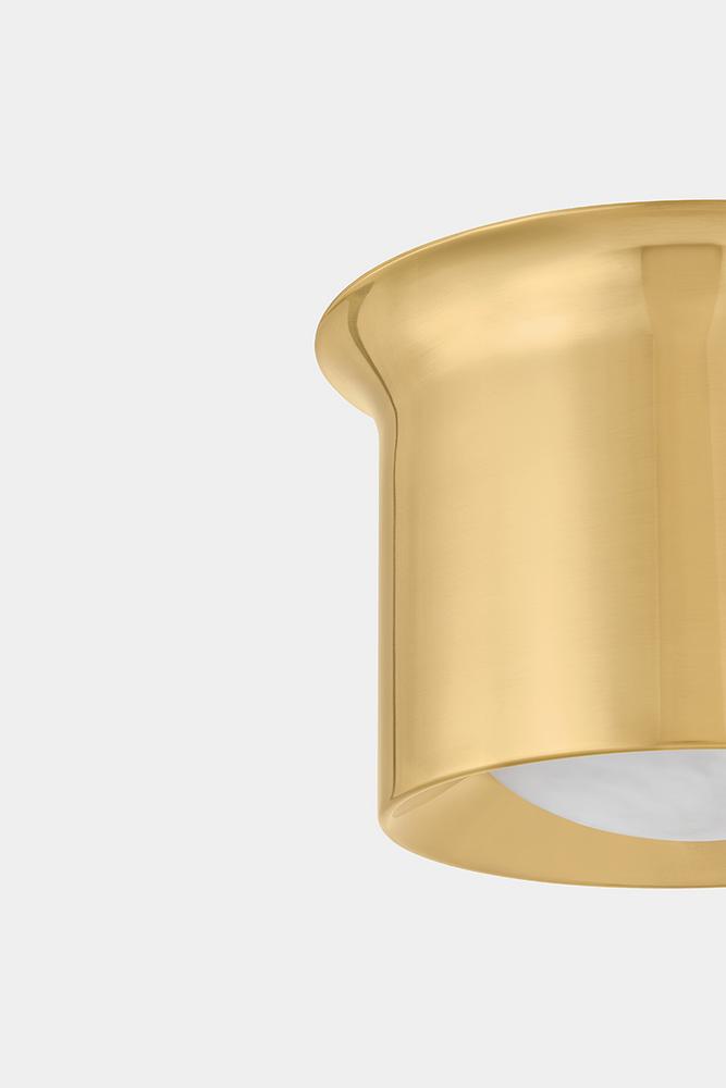 A sleek flush mount with unadorned metalwork, Noxon celebrates the beauty of simplicity. Situated within the metal frame, the matte cloud glass shade washes light around the reflector. with a gentle swell at the canopy, the frame creates the effect of flowing into the ceiling. Noxon is available in a classic Aged Brass or more industrial Distressed Bronze finish.