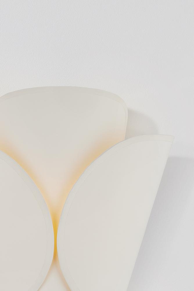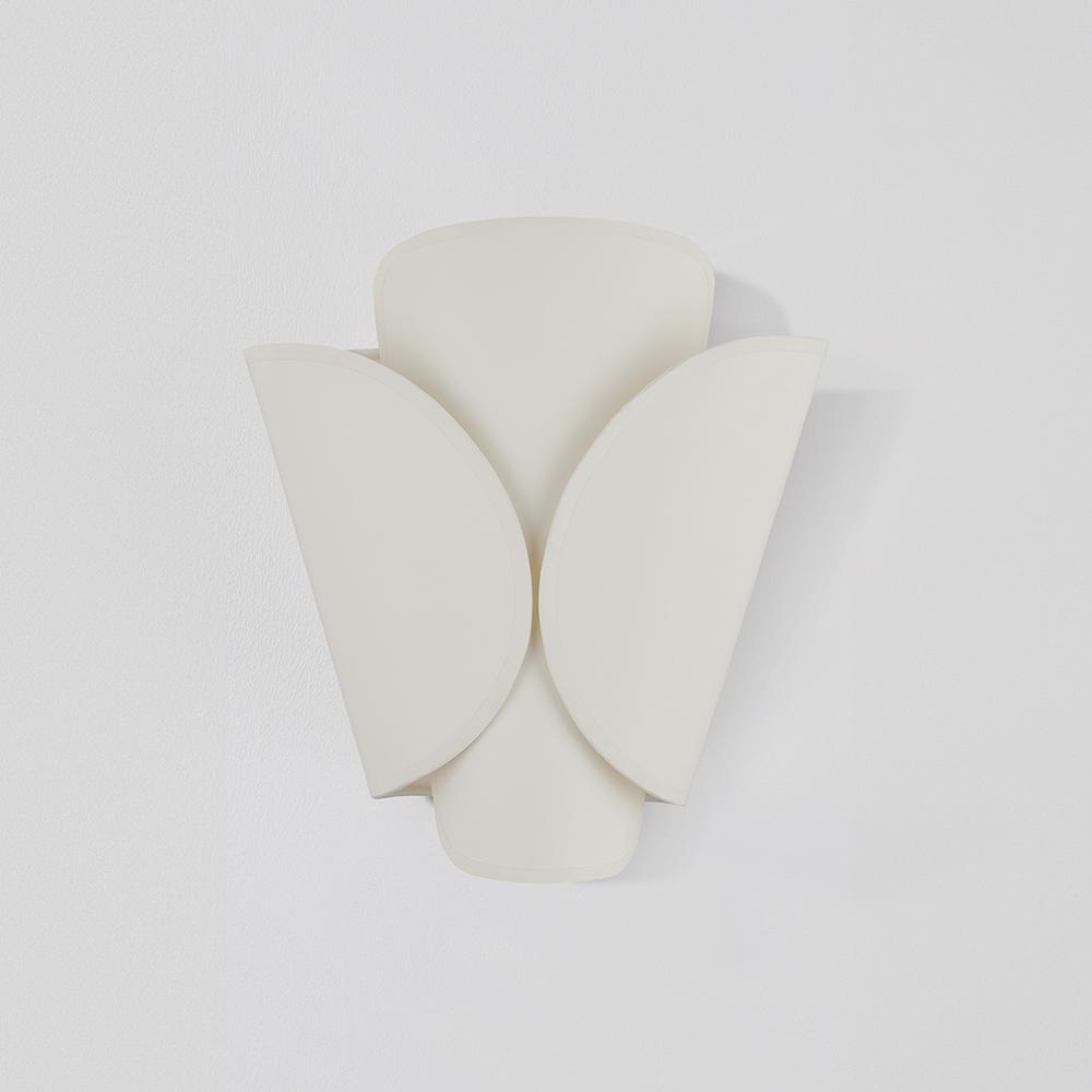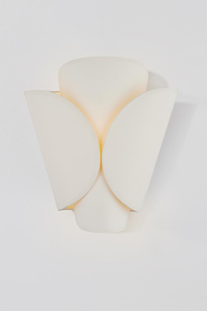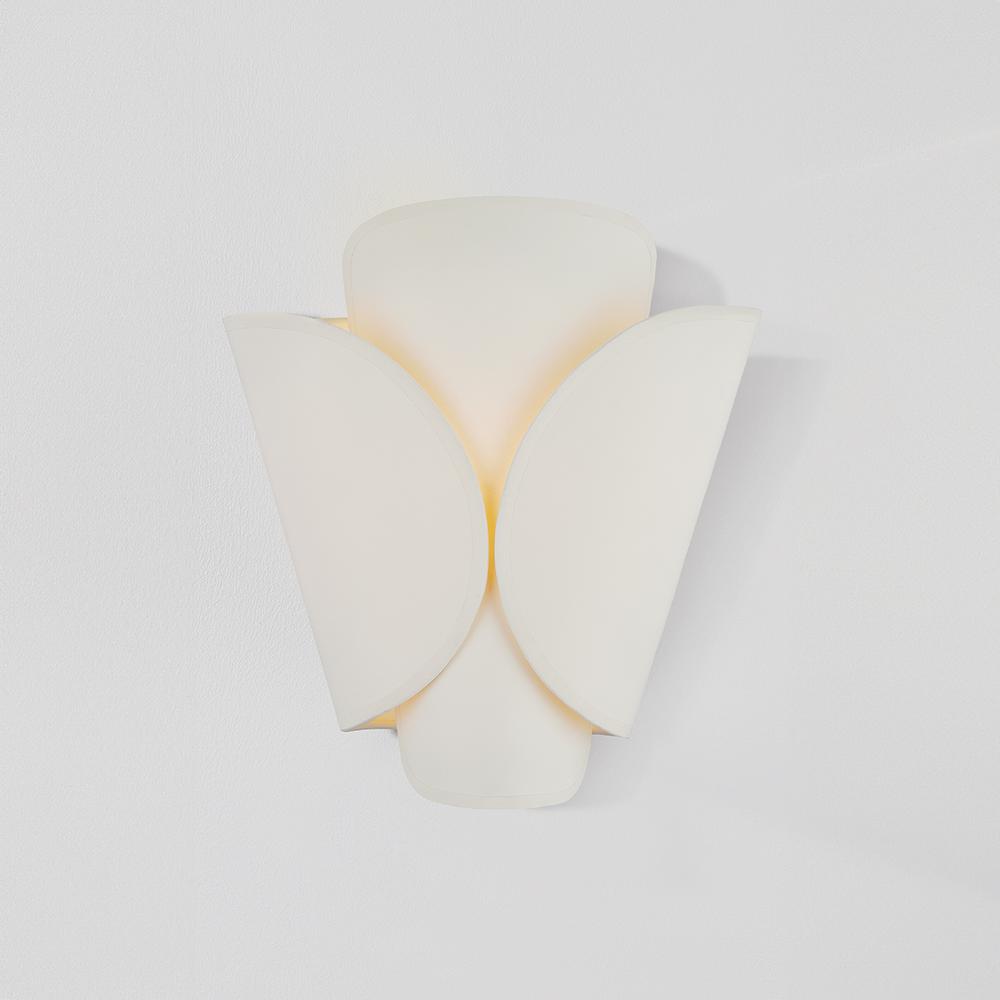 Inspired by the wings of a butterfly, this modern sconce features a layered shade wrapping an E12 base. As the outer shade folds inwards, it leaves a small gap that creates an intriguing play between the two layers. Choose from either an Aged Brass outer shade and parchment inner shade or an all-parchment fixture.