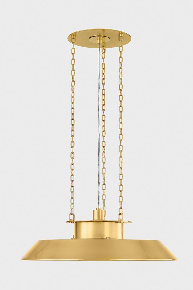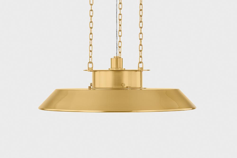 Taking cues from the innovative lamping techniques of bespoke maker brands, Woodrow features a classic RLM-style pendant silhouette. Beneath the large reflector, the opal shiny shade filters light both downwards and outwards. Three clean chains suspend this fixture, which is available in two sizes.