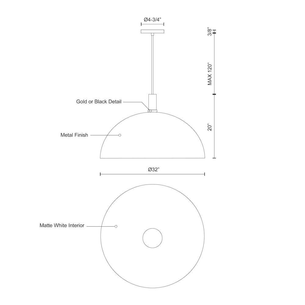 Single-lamp pendant with aluminum dome shade showcasing powder-coated or plated finishes with metal details and a matte white interior. Exterior shade colors are black, brushed nickel, or white. Suspended by cloth cable. Available in three sizes.