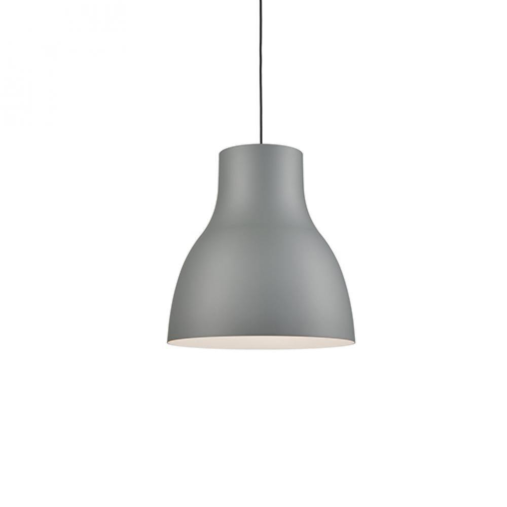 Single-lamp pendant with tapered aluminum shade showcasing powder-coated finishes. Exterior shade colors are either black, gray or white, with matte white interior. Suspended by cloth cable . Available in three sizes.