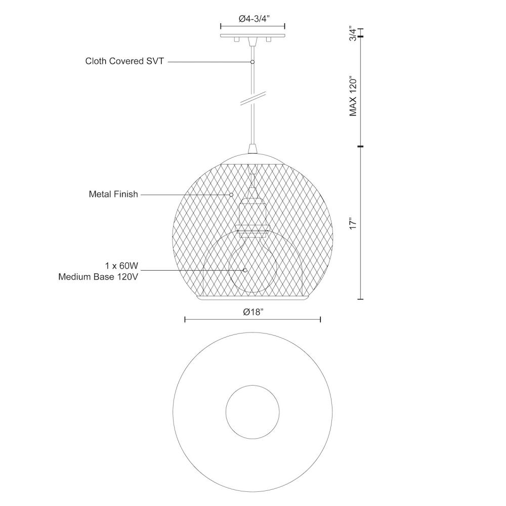 Single lamp pendant with spherical powder-coated wire mesh shade. Color configurations include uniform black or an exterior black with inner gold mesh. Suspended by matching cable. Available in 2 sizes.