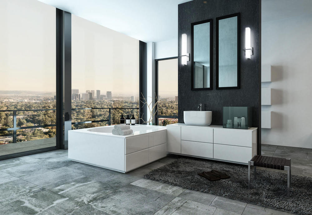 Round or square plated or painted steel frame and wall plate. Rectilinear opal glass diffuser. Outward emitting wall light. Custom options available.