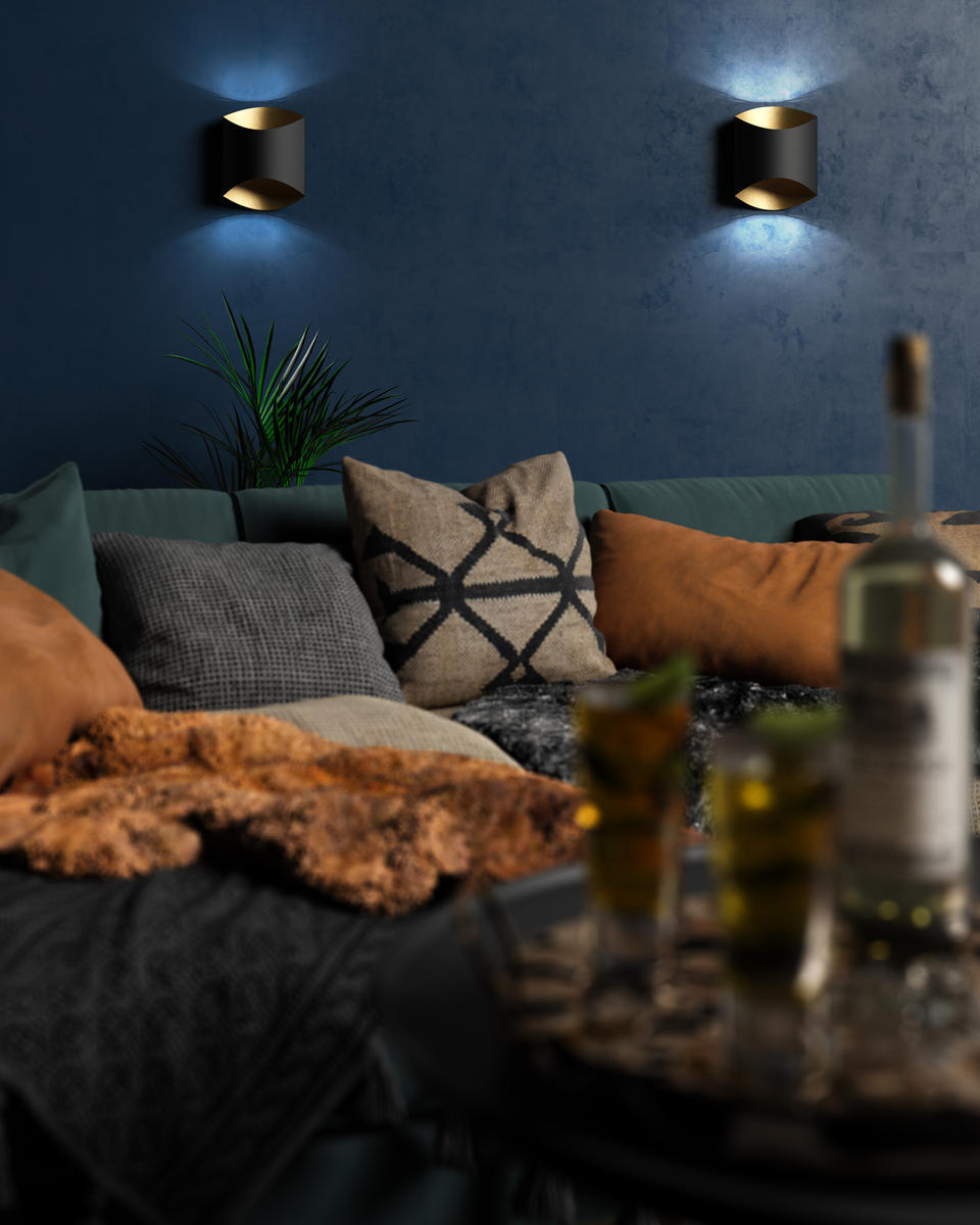 Single lamp LED wall sconce with either a flat black with fine gold interior or white with sleek silver interior unique metal casing. Equipped with our powerful 12V AC LED technology