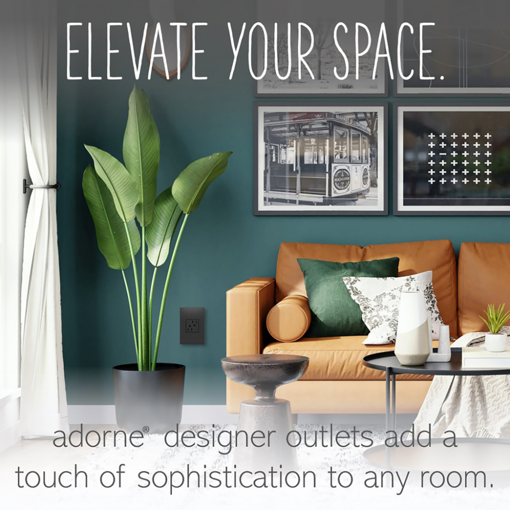 A modern upgrade for style and safety, this tamper-resistant designer outlet from the adorne Collection installs easily for the basic power every home needs, while elevating your space. Made exclusively for use with screwless Wall Plates from the adorne? Collection, sold separately.