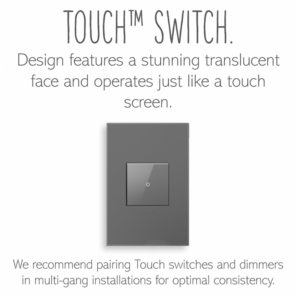Perfect for anywhere you'd like to upgrade a standard switch with sleek, intuitive touchscreen technology. This stylishly minimalist modern light switch functions just like your smartphone's touch screen - simply touch your finger to turn lights on and off. Use this device on its own to control a light or fixture from a single location, or pair with a second switch to control a single light source from two locations (3-way control).This switch* features enduring Microban? antimicrobial technology that works to reduce the growth of bacteria, around the clock, for the lifespan of the product.* Existing inventory of switches, dimmers and plastic wall plates from the adorne? Collection at some partner locations may not yet include Microban? protection. To confirm that a specific Legrand product is protected with Microban?, check that the exterior of the product packaging includes a green dot or a ""Protected with Microban"" label.Made exclusively for use with screwless Wall Plates from the adorne? Collection, sold separately.No antimicrobial efficacy claims are being made or are valid with respect to products sold in Canada.