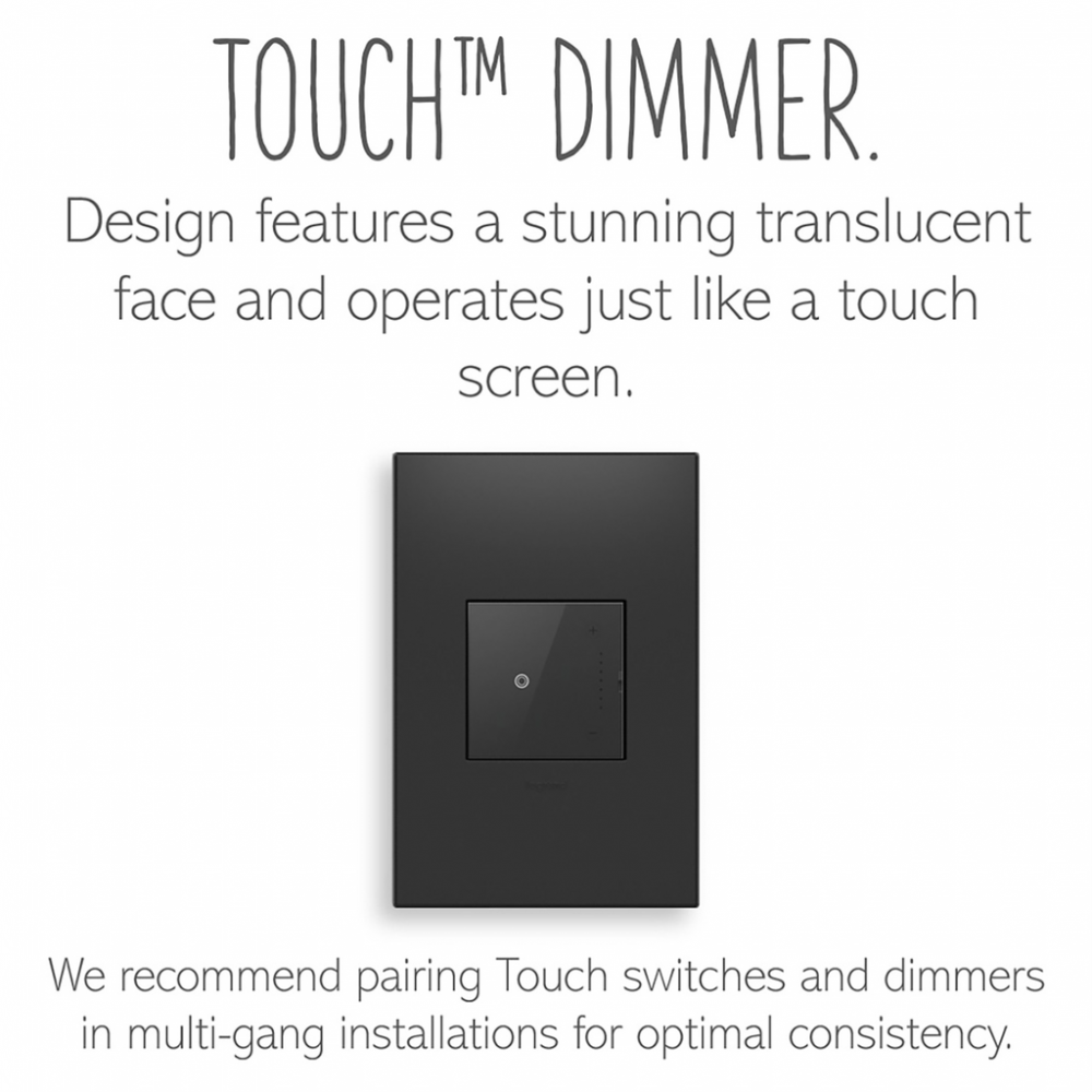 This dimmer switch from the adorne Collection features a translucent, glass-like face and operates with the simple touch of a finger on the center circle to turn lights on/off, or by using the + or - on the side to dim. In multi-gang installations, we recommend using the Touch-control modern light switches and dimmers together for consistency of control and aesthetic. A Tru-Universal Dimmer, this device self-calibrates to work with virtually any 120V dimmable bulb or fixture (excludes 0-10V).This dimmer* features enduring Microban? antimicrobial technology that works to reduce the growth of bacteria, around the clock, for the lifespan of the product.* Existing inventory of switches, dimmers and plastic wall plates from the adorne? Collection at some partner locations may not yet include Microban? protection. To confirm that a specific Legrand product is protected with Microban?, check that the exterior of the product packaging includes a green dot or a ""Protected with Microban"" label.Made exclusively for use with screwless Wall Plates from the adorne? Collection, sold separately.No antimicrobial efficacy claims are being made or are valid with respect to products sold in Canada.
