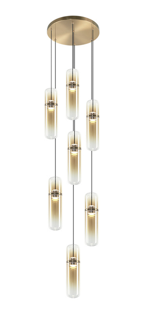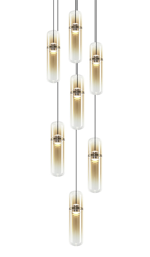 Amulet Sleek sophistication meets sculptural luminosity in this modern pendant series. Each elongated glass capsule features a softly tinted center that transitions to clear glass at the top and bottom, creating a refined gradient effect and warm, atmospheric glow. The Champagne Gold finish pairs with amber-tinted glass, while the Matte Black finish pairs with smoked-tinted glass, each offering a distinct and contemporary expression. Suspended from a coordinating canopy, the pendants float gracefully, adding movement and visual interest to any space. Features a 5CCT switch inside the canopy to adjust the 5 selectable colour temperature