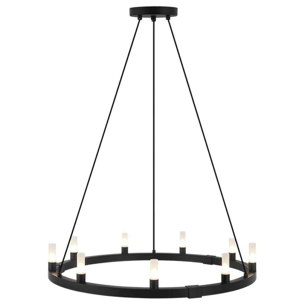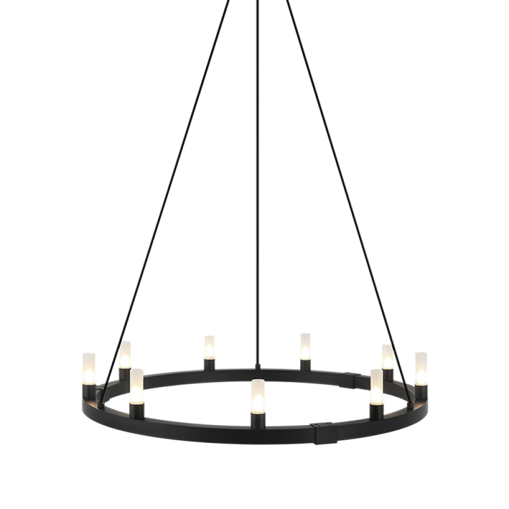 Need a statement piece – The Cascadian series will certainly deliver! Round and rectangular frames are both available and neither style will disappoint. Small glass shades line the Aged Gold Brass or Matte Black frame and are suspended by black fabric cords. Single layer and 2 two tier fixtures equally pack the WOW factor.