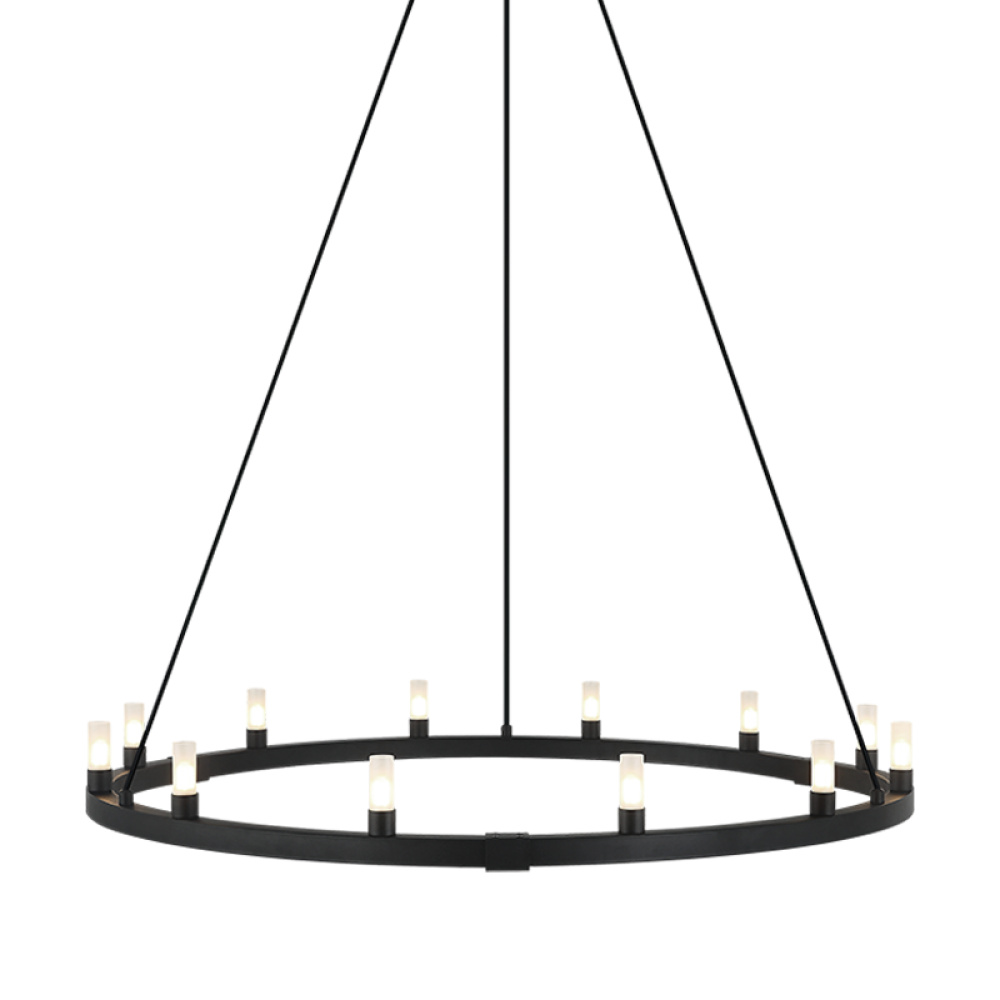 Need a statement piece – The Cascadian series will certainly deliver! Round and rectangular frames are both available and neither style will disappoint. Small glass shades line the Aged Gold Brass or Matte Black frame and are suspended by black fabric cords. Single layer and 2 two tier fixtures equally pack the WOW factor.