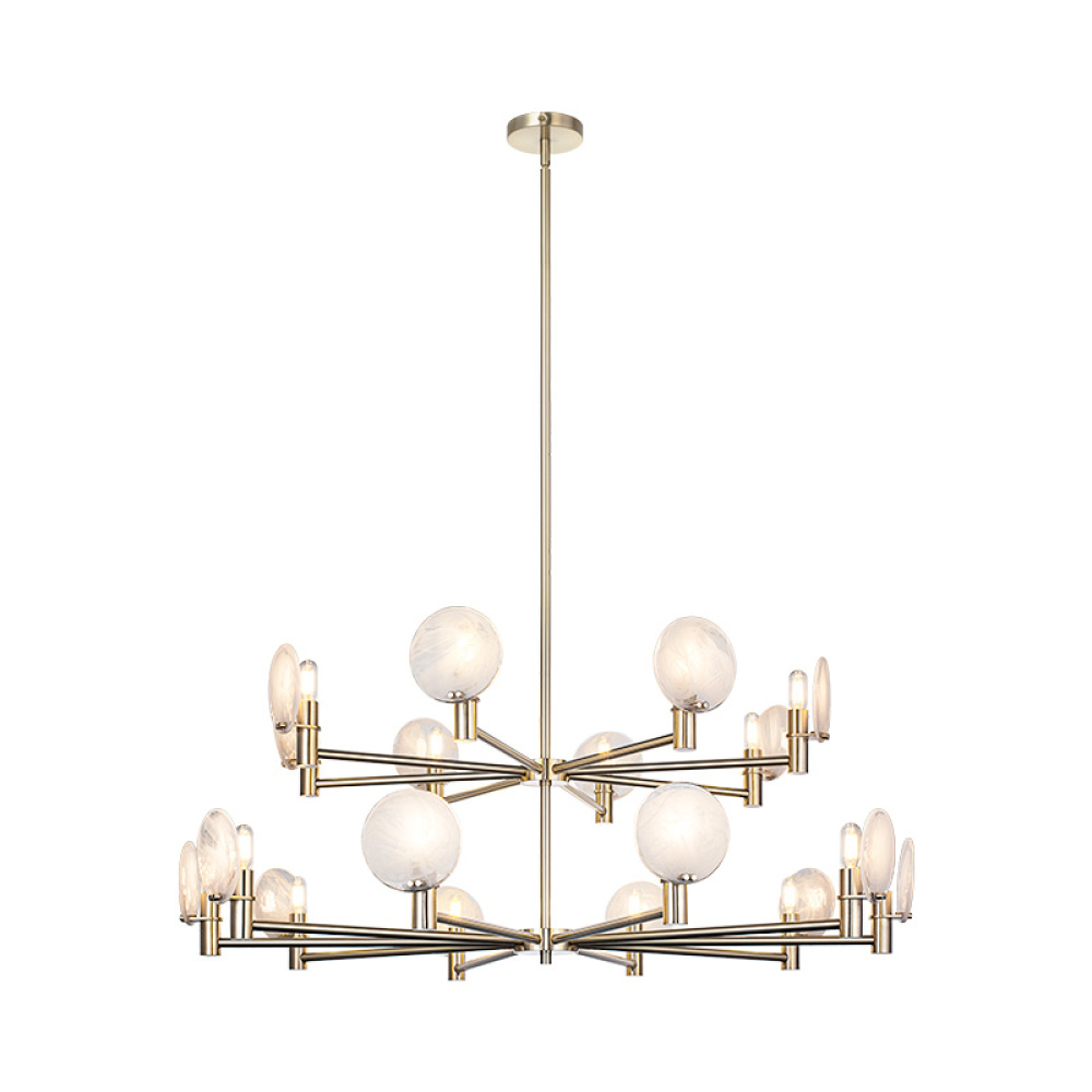 This chandelier blends mid-century modern with space-age sophistication ideal for upscale dining rooms, creative studios, or hospitality spaces aiming for an artistic edge.This can be shown with the light emitting up or down.The cloudy swirl glass gives it a soft touch to the design.