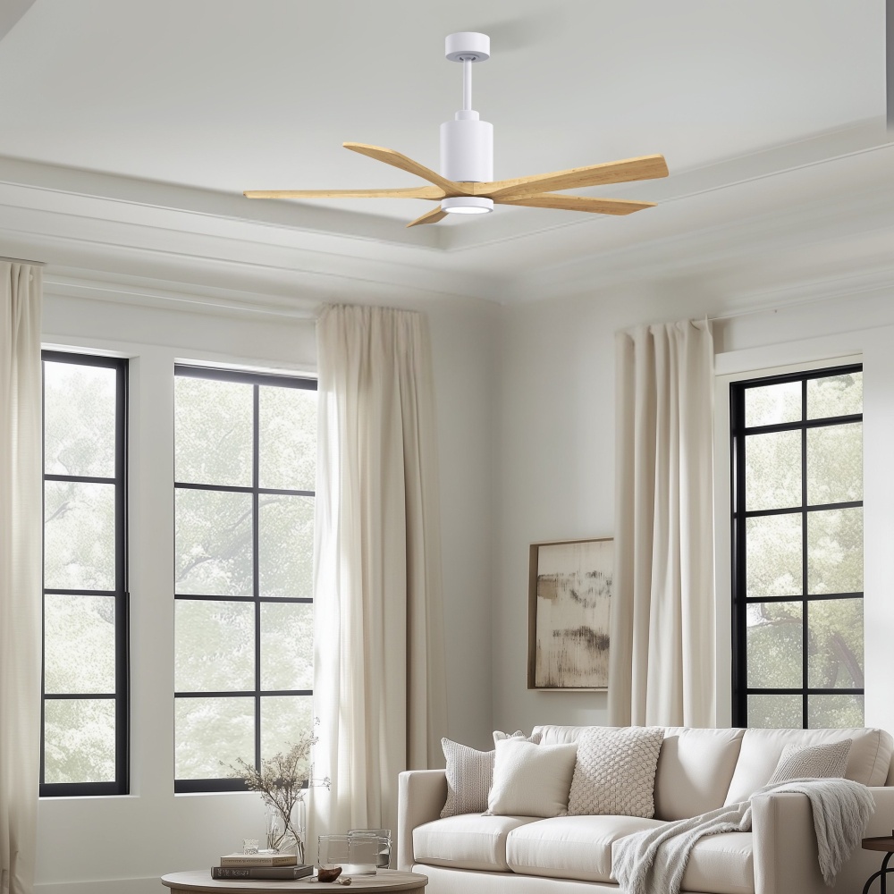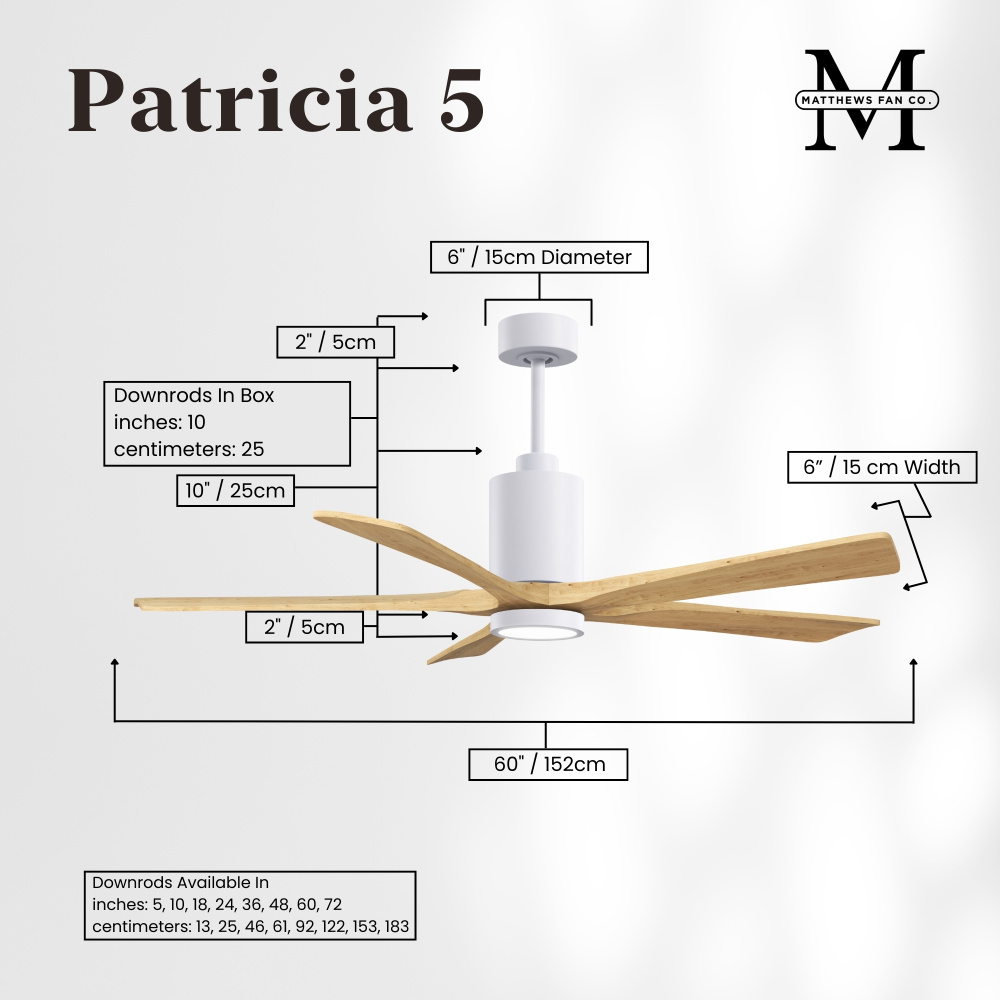 A complement to any commercial or residential space, the Patricia 5 seamlessly combines innovation with simple, refined design. Its elegant aesthetic belies its robust construction. Solid wood blades revolve around a balanced, cylindrical DC motor housing. Air is circulated efficiently with barely more than a whisper. An eco-conscious LED light kit completes the package, making Patricia 5 sophisticated, efficient and green.