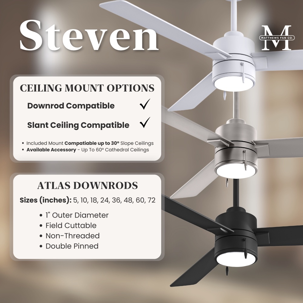 The Steven Ceiling Fan blends minimalist design with powerful performance, making it ideal for any space. Available in 42” and 52” plywood blades, it comes in three finishes with matching blade options to suit your style. An integrated 3000K LED light kit, pull chain, and optional wall control offer convenience, while its damp-rated durability ensures versatility. Backed by a limited lifetime warranty, the Steven delivers timeless elegance and quiet efficiency for years to come.