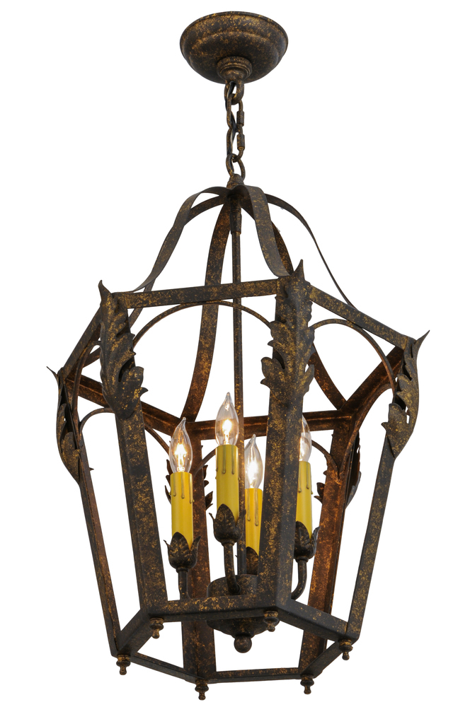 Welcome a handsome eclectic look into your home or business with the stunning Acacia Pendant. This lantern integrates a distinctive motif with classic styling. Four Amber faux candlelights on floral bobeches are revealed inside the decorative frame which is highlighted in a stunning Old Gold finish; This Solid Lantern with Acanthus Leaf Accents and Decorative Finials completes an evocative impression with a compelling design and beautiful ambient illumination. Custom crafted by highly skilled artisans in our 180;000 square foot manufacturing facility in Yorkville; New York. This luxurious fixture is available in custom finishes; sizes and colors; as well as energy efficient LED lamping. UL and cUL listed for damp and dry locations.