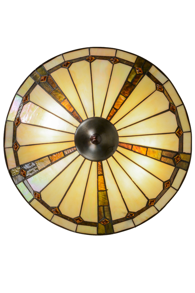Exquisite Purple; Dark Green and Sunburst colored trim with Amber jewels adorn Beige Iridescent glass on this conical shade. This stunning shade is constructed with Meyda Tiffany's famous copperfoil construction process. The hardware is finished in a warm Mahogany Bronze.