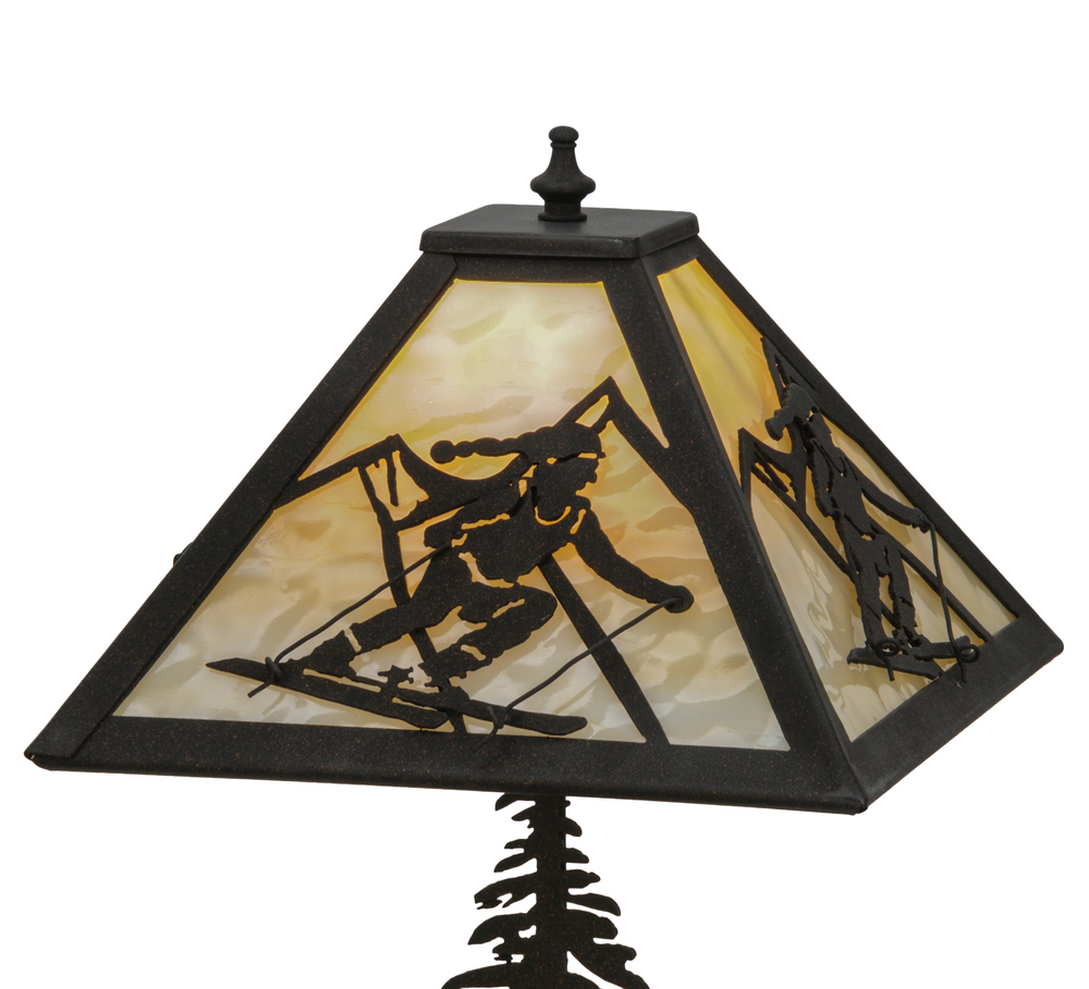 A winter skier slaloms down the slopes during an epic skiing event with a mountain range in the background. Warm ambient lighting is diffused beautifully through Beige Iridescent glass enhanced by a frame and Pine tree base featured in a Dark Roast finish. This lamp is ideal for nightstands; occasional tables and desks. Handcrafted in the Meyda manufacturing facility; located at the foothills of the Adirondack Mountains; not far from Lake Placid; home of the 1980 Winter Olympics. Custom designs available; as well as energy efficient lamping.