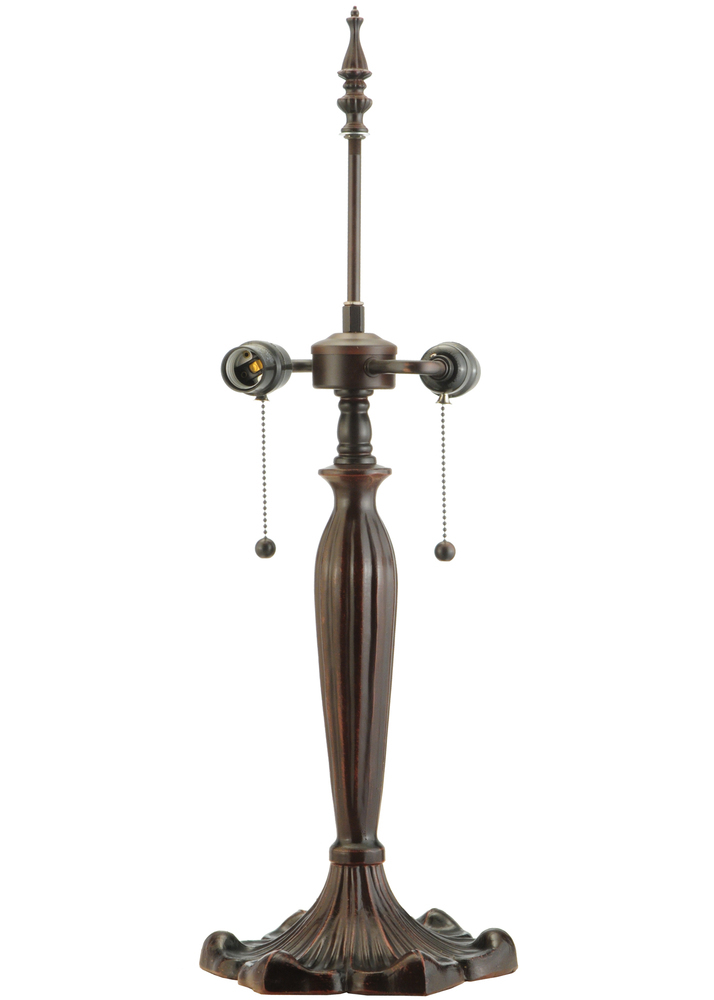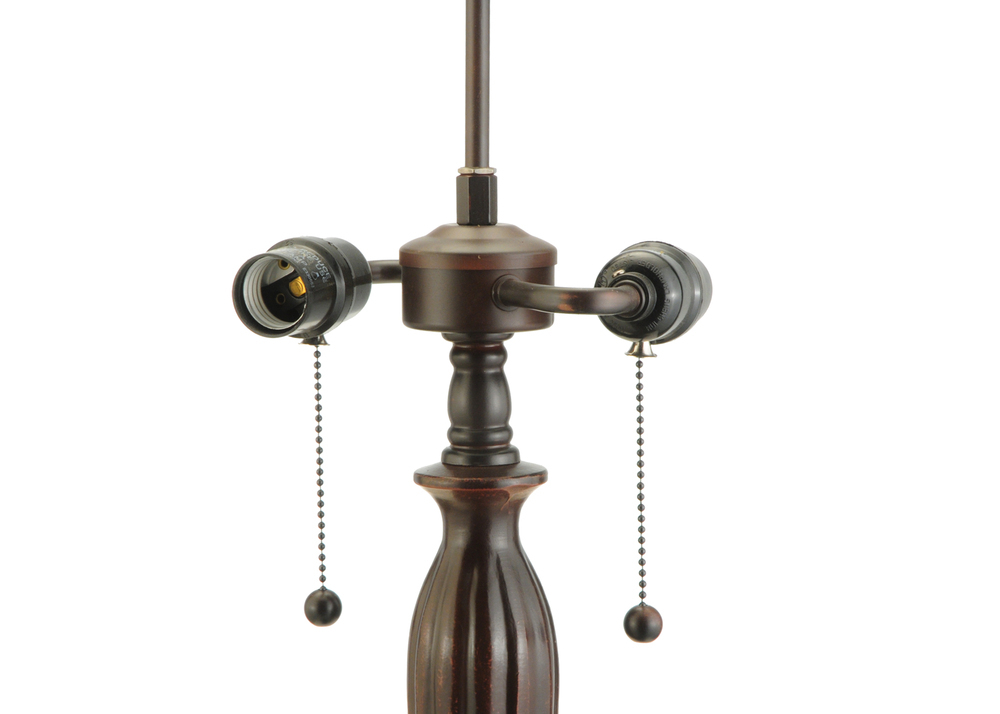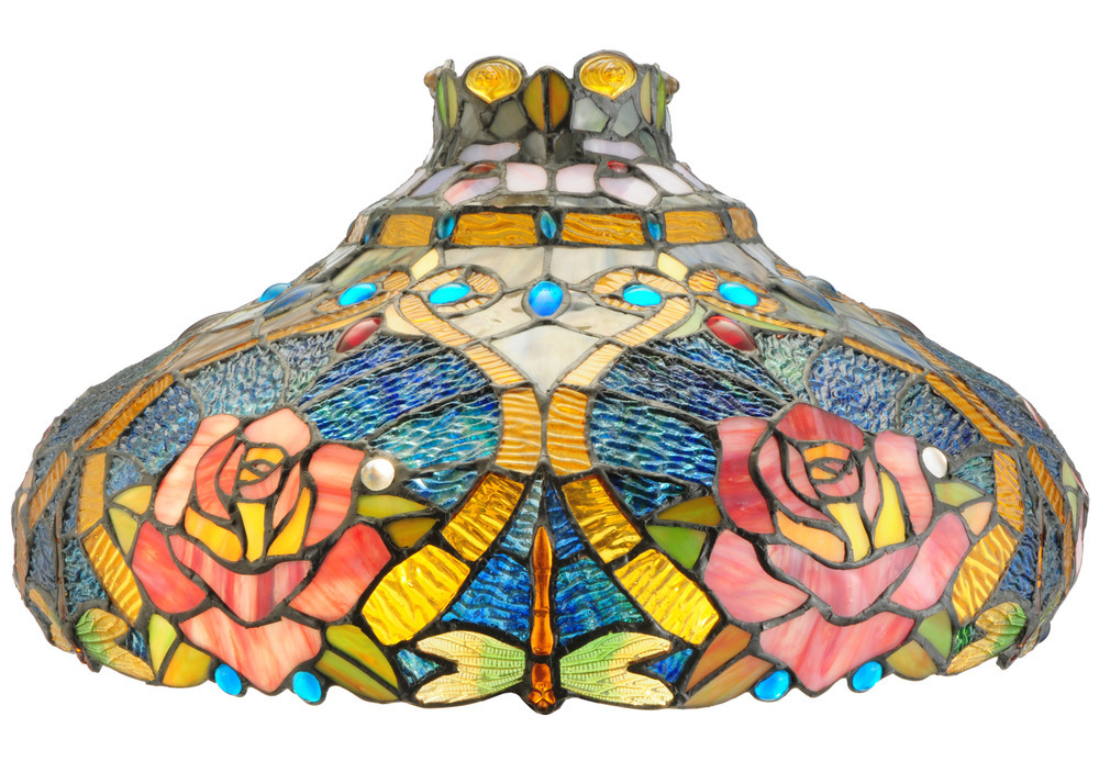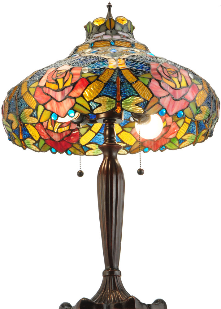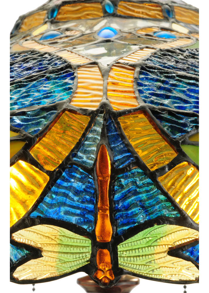 A Dragonfly dives downward with glowing Golden jeweled body and eyes and delicate Gold/Green glass wings while circling over hand-cut and copperfoiled pieces of Golden art glass accented with colorful Aqua Blue; Red and Amber jewels. Yellow and White with Red swirled Roses are encircled with scrolls of Gold on Blue ripple glass background with Aqua Blue glass jewels. The shade; which is created with Meyda Tiffany's famous copperfoil construction process and crowned with Violet flowers; is complemented with a Mahogany Bronze finished base.