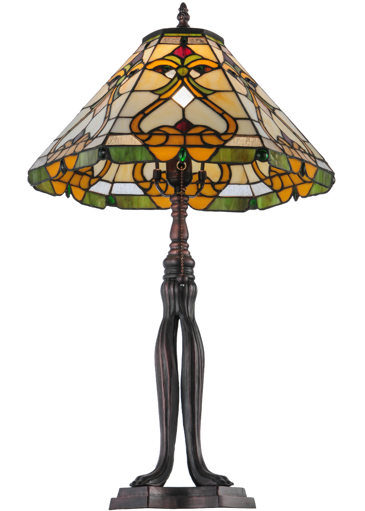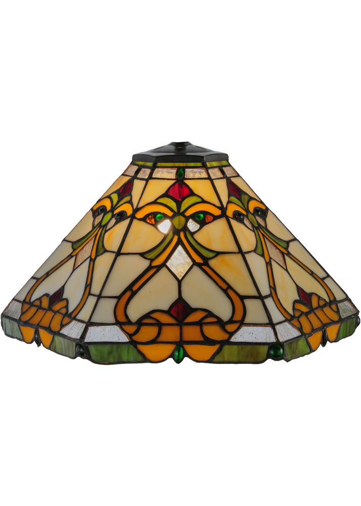 Victorian charm in beautiful stained glass for a striking festive look best describes Middleton. Leafy Green Holly entwined with Saffron and Ripe Red Berry accents and Green jewels that highlight this decorative design on a Bone Beige background background; trimmed in Green and Clear Seedy glass. The art glass shade was created using Meyda Tiffany's famous copperfoil construction process and enhanced by decorative hardware finished in a warm Mahogany Bronze.