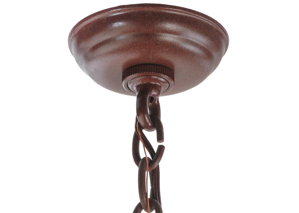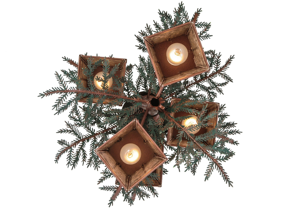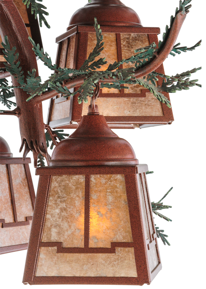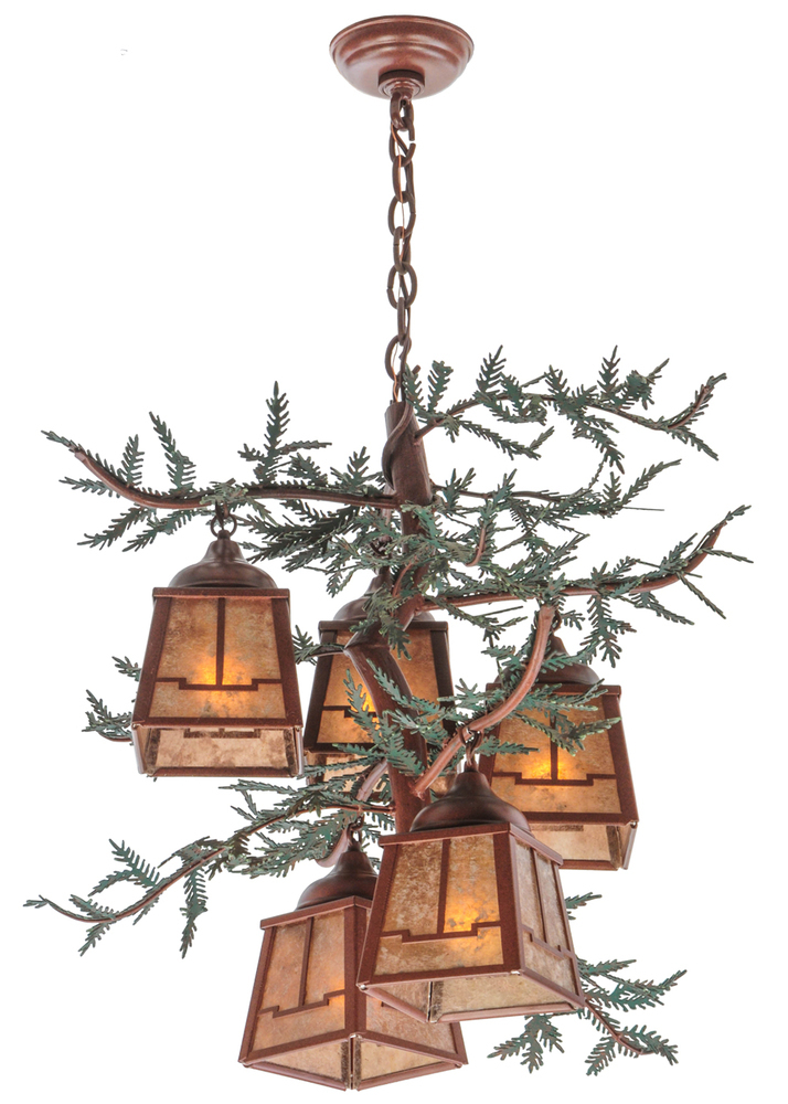 This spectacular Nature-inspired chandelier is handcrafted with five small Silver Mica lanterns that are attached to pine branch-shaped arms accented with Green hand painted pine needles. ?The hardware is finished in Rust. ?Although wired for candelabra incandescent bulbs; we provide energy efficient LED lamps to save energy; reduce re-lamping and maintenance; and provide a long-lasting life of 50;000 hours.