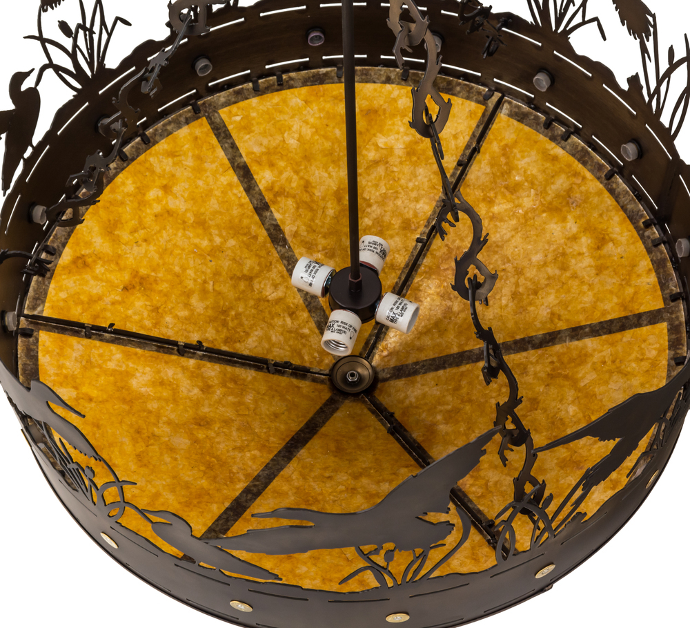 A flock of Ducks in and above cattails and marsh grasses top this wildlife inspired original pendant handcrafted in the USA by Meyda artisans. Suspended from hand crafted branch like chain links the bullet accented band and Ducks top Amber mica panels. This fixture is finished in Antique Copper.